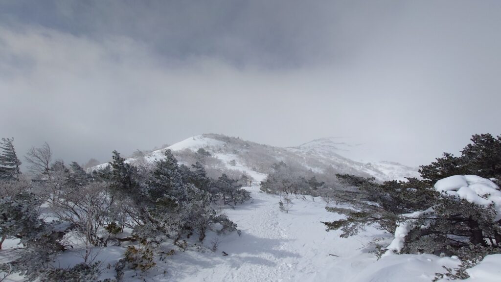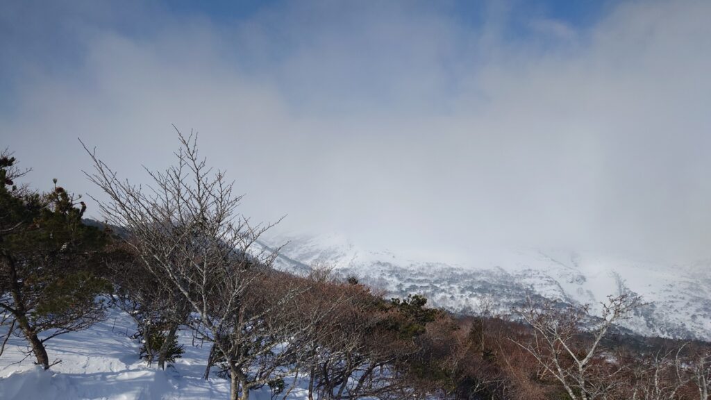 ゲレンデトップまでの標高差は200mくらい。リフト使うまでもないです。登山者用の道を歩き、ゲレンデに出てからは左端を歩きます。このゲレンデはやってないみたい。ゲレンデトップからは木が混んでくるけど、登るのには支障なしでした。でも、多分雪は少ないんだと思われます。2017年にも来てますが、記憶は全くございません。薬師岳付近で木が低くなると風を受けます。稜線は全く見えず…。