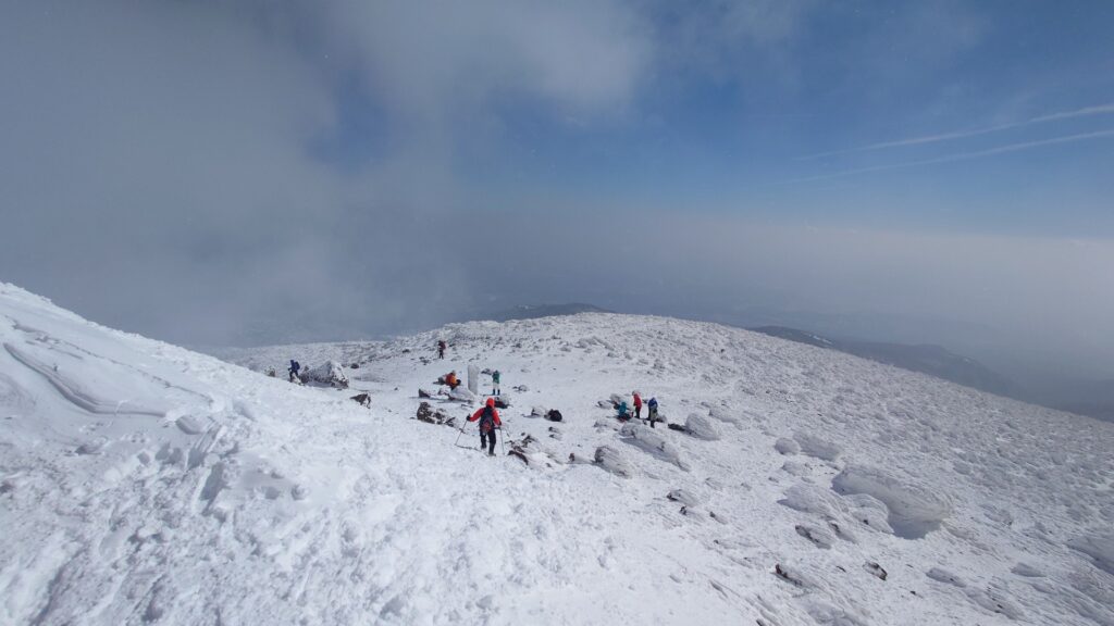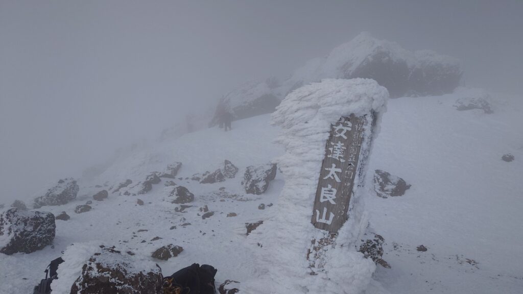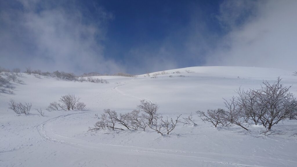 山頂に登ってみると、真上の空は晴れてても周囲が全部見えてはなかったです。でも、これから向かいたいと思ってる船明神山が見えた時はうれしかった。全容はなかなか見えなかったけど、船明神山まで辿る尾根、滑る斜面と登る斜面が確認できました。視界がない中を歩く際にはイメージが重要ですからね。山頂にいる間、晴れたりガスったりを繰り返してました。回復傾向なのかなとも思いますが、もしかしたらずっとこうだった可能性もあります。
