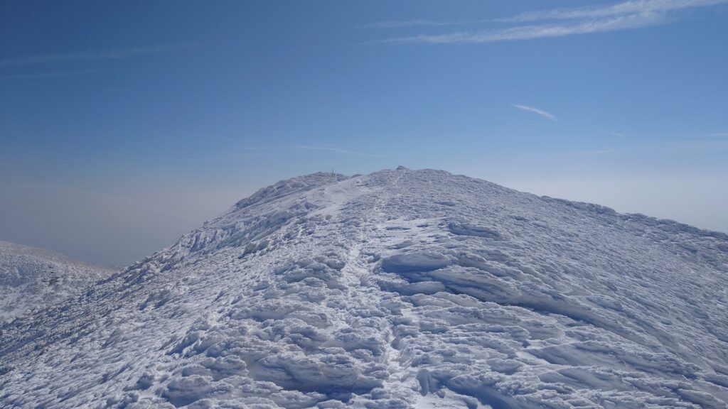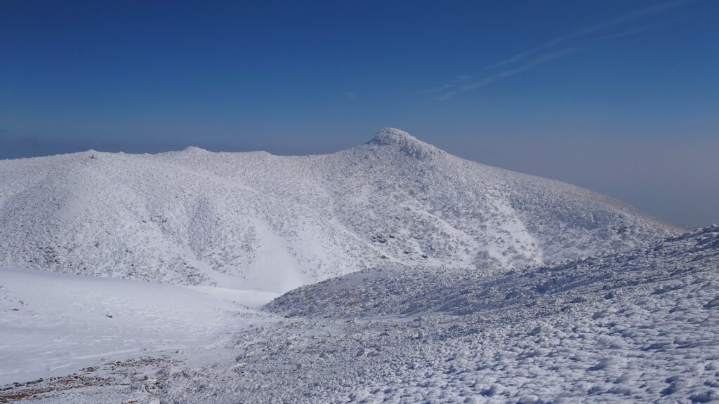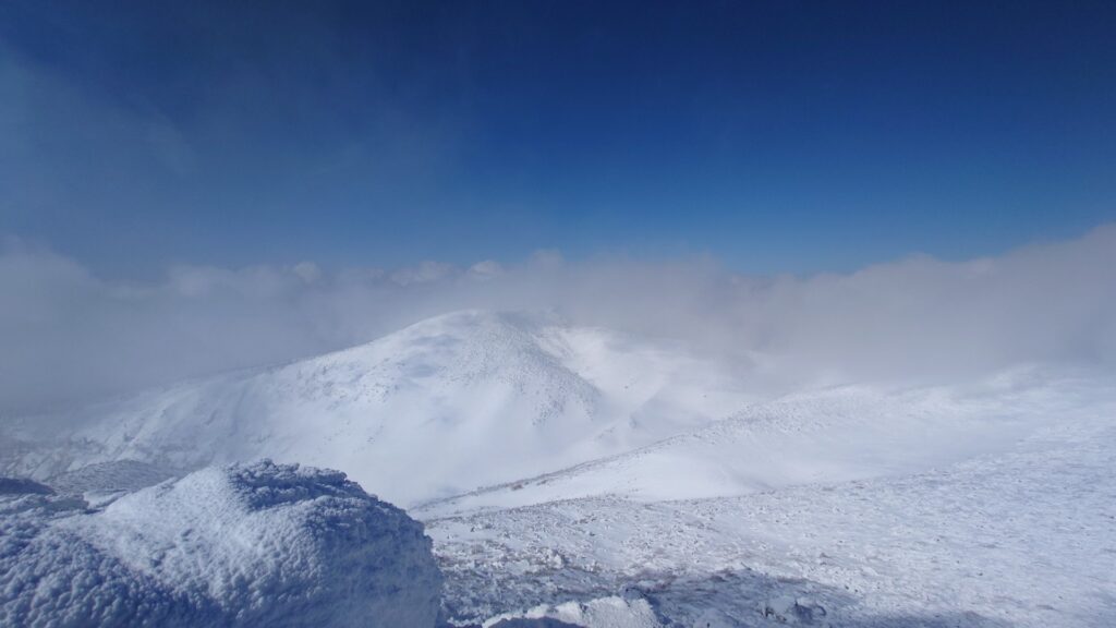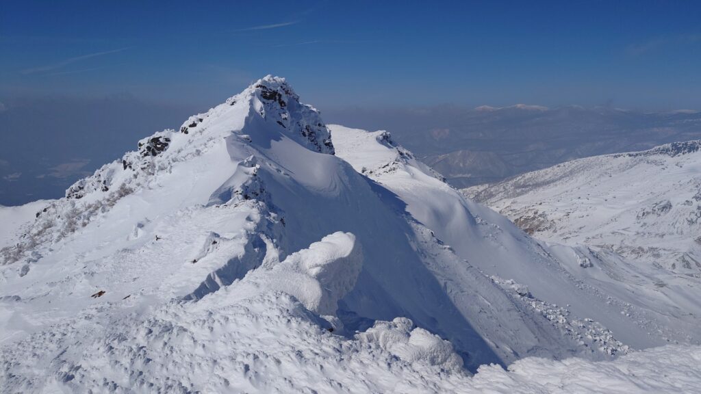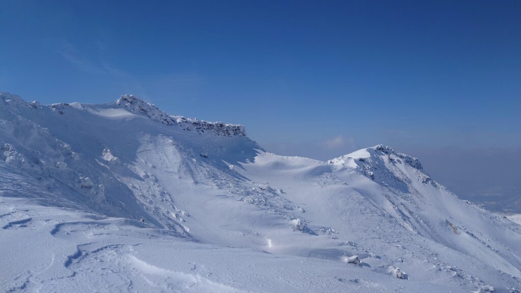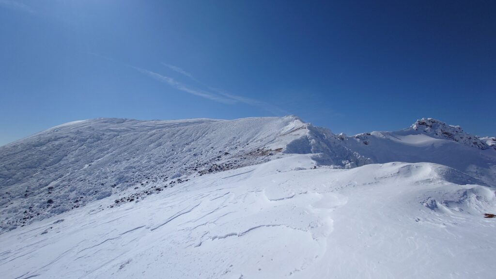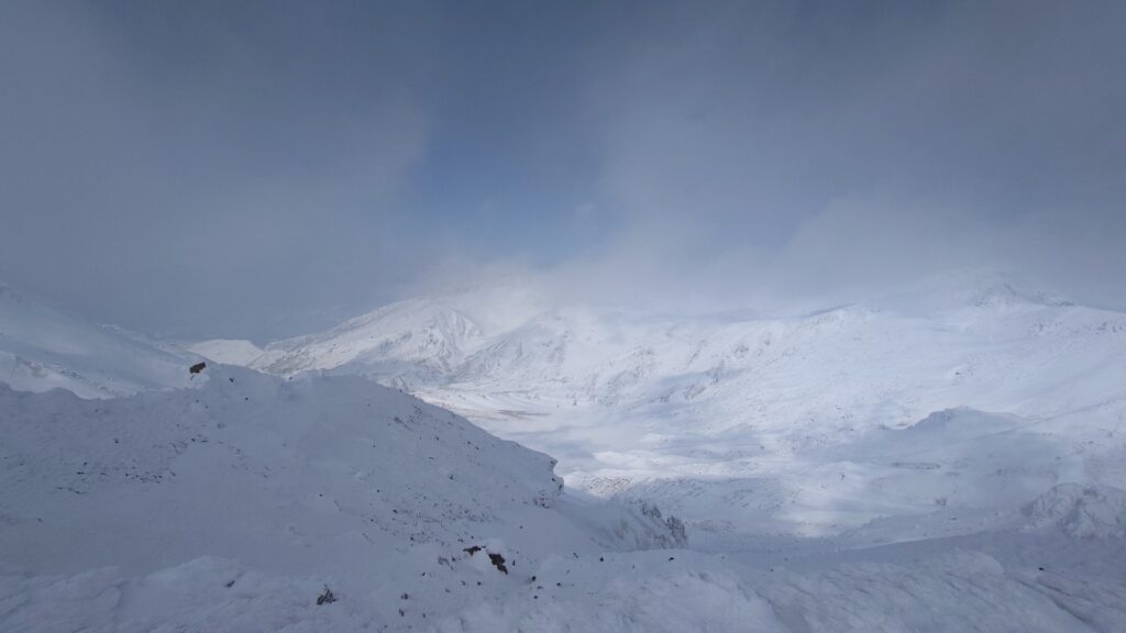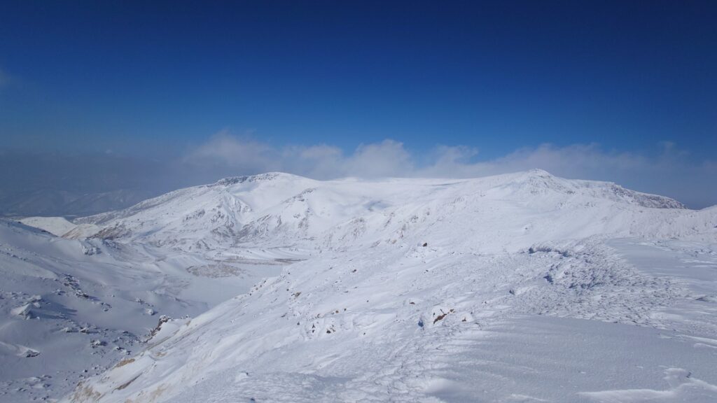 沼ノ平を見下ろすロケーションは圧巻ですね。沼ノ平を取り巻く火口壁も荒々しい。ただ、雪のない時期は月の砂漠といいますか、日本とは思えない惑星感が感じられました。雪で覆われてしまうと惑星感はなくなっちゃいますね。沼ノ平は有毒ガスが出てて、だいぶ昔になるけど事故が起きてます。有毒ガスが出てなければ絶対に下まで降りてみたいです。まだ山を歩ける間に解禁にならんかなあ~