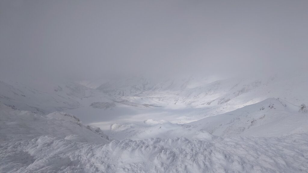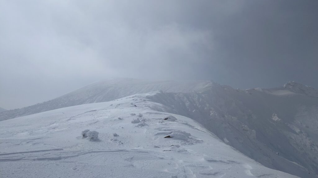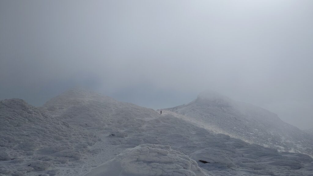 岩峰から下りてアイゼンを履き、ザックに板を着けて尾根歩き開始。歩き始めはガスガス。なんとなく足跡あるので、それを辿っていけば大丈夫そう。たまにガスが薄くなって景色が見えると安心しますね。ルートはまあいいとしても、風がしんどいですね。板を背負ってるので煽られます。