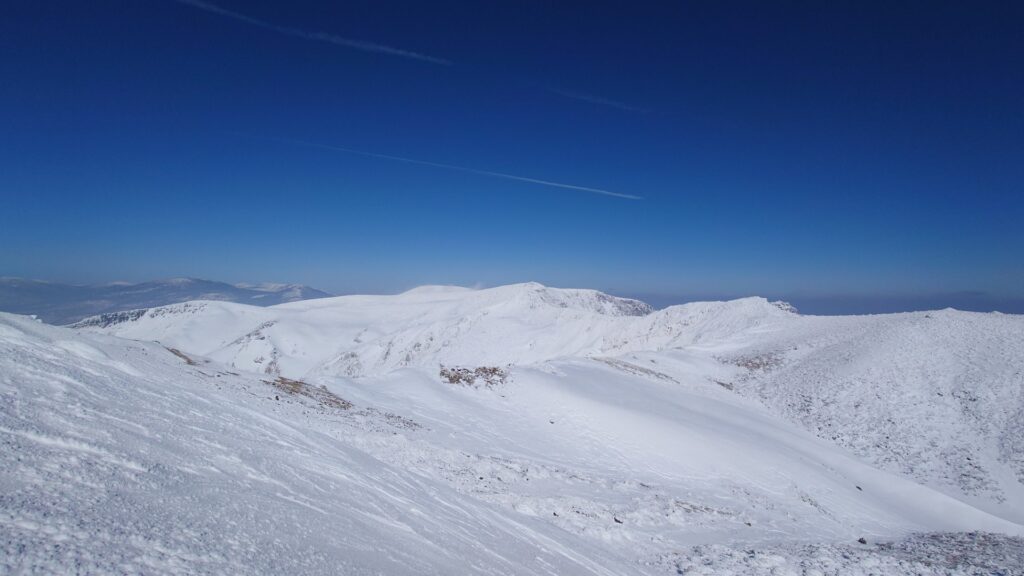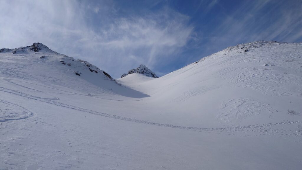 尾根道に戻って、とりあえず矢筈森に登ってみます。ここから滑れるかと思ったら、山頂からは斜面がつながってません。岩峰をクライムダウンする必要あり。ほんの5mくらいだがスキーブーツだと不安。夏道だとグルーっと大回りになる。でも、落ちてもケガはしないか…ということでクライムダウン。一手だけ緊張した。降り立ったところがくろがね小屋方面への沢と登りルート方面の沢の分水嶺。どっちを滑ろうか迷います。まさに分水嶺。