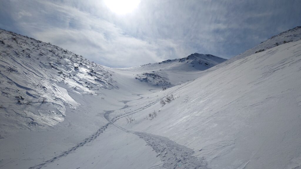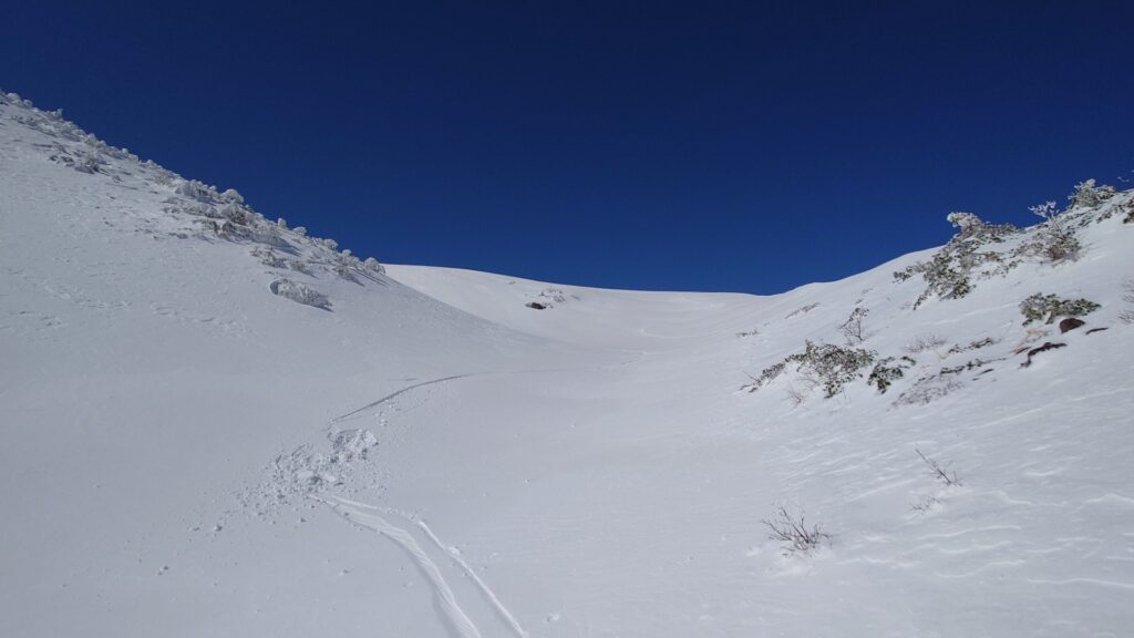 くろがね小屋方面への沢を滑ることに