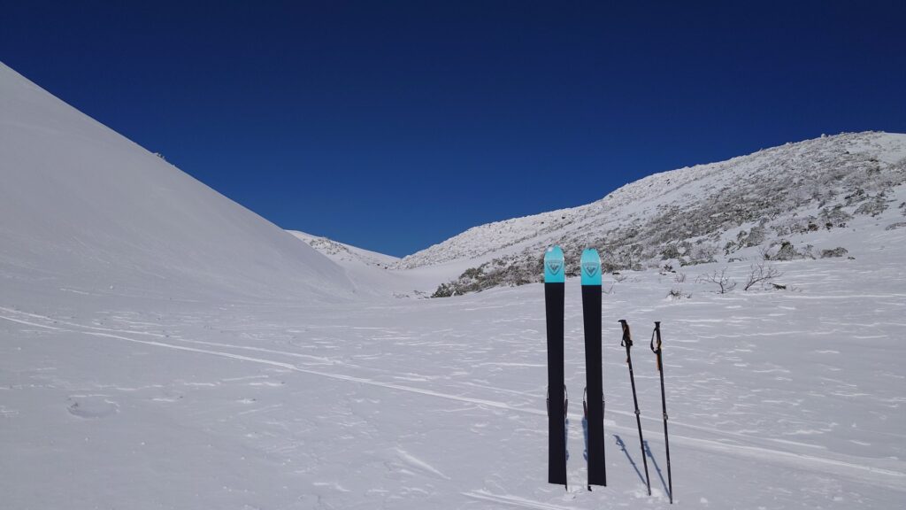 滑る準備をして分水嶺に立ちます。くろがね小屋方面の沢に決定。でも、あとから考えたら滑ったことない方にしとけばよかったと思いました。まあ、また行くか。ここも例に漏れず雪は堅い。テレマークだと弾かれるので封印。板を揃えて滑ります。アルペン滑りというにはカッコ悪いかな…。適度な斜度でロケーションも素晴らしい。あっという間に終わってしまいます。