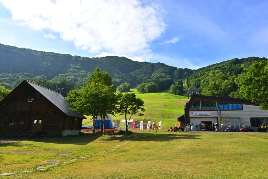 ヤマレコとかで見てみると、最近はタングラムから周回で登ってる人が多いようです。それにウチも倣います。タングラムのホテルを通り抜けてゲレンデへ。観光リフトで野尻湖テラスまで登れるみたいだけど、始発は9時からとなってます。ただ今の時間は7時40分。待てんな。値段は往復も片道も1500円みたい。
