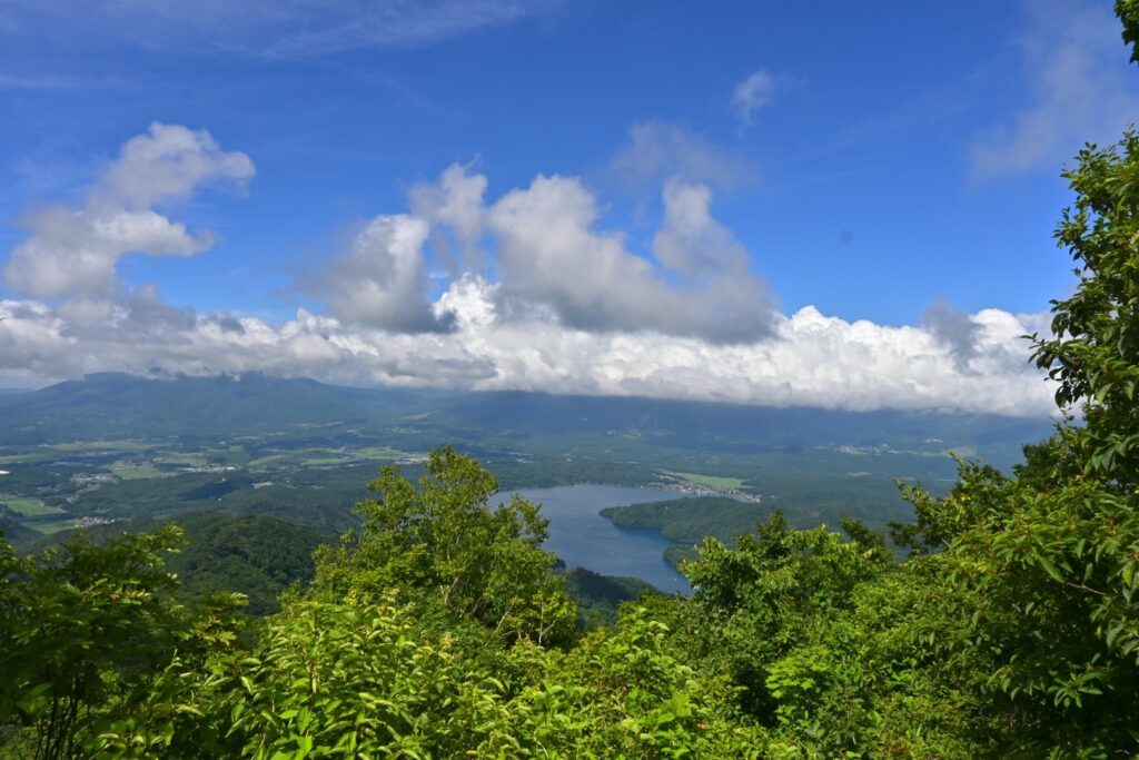 山頂から南西に進むと大明神岳があります。ここは展望が素晴らしいとのウワサ。エアリアにも展望が良いと書いてあります。行ってみますと、妙高・黒姫と野尻湖の方向が開けてて展望あります。しかし、それ以外は展望なし。野尻湖テラスで増殖中だった雲はさらに増殖し、妙高や黒姫がどこにあるだかわからないくらいまで増殖。この暑さで空気も霞んできました。そんな感じで大明神岳は期待外れに終わってしまいました。また来るとしても秋か初冬かな。