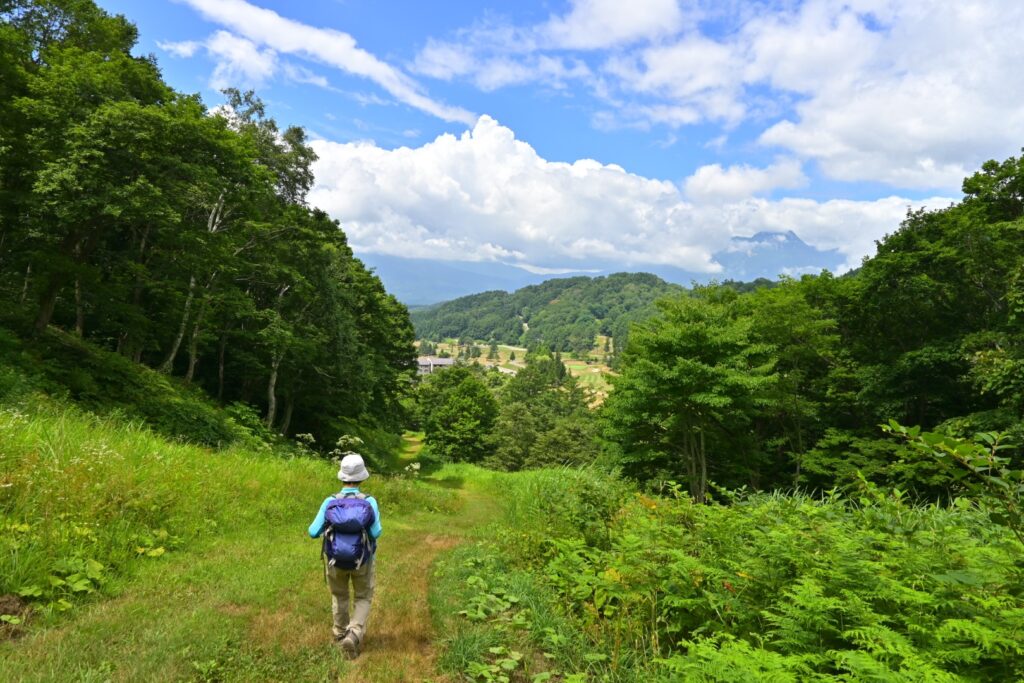 さて、戻ります。ピークを2つ越えてきたので、帰りもピークを2つ越えないといけません。たいした登り返しじゃないけど、気分的にメンドクサイ感じですかね。あと暑いのと。下りは万坂峠経由にします。こちらもほぼゲレンデ下りだけど、信越トレイルのルートになってるので整備状況は良好でした。でも、単調なので飽きますね。ホテルが見えてきてからが長かった。