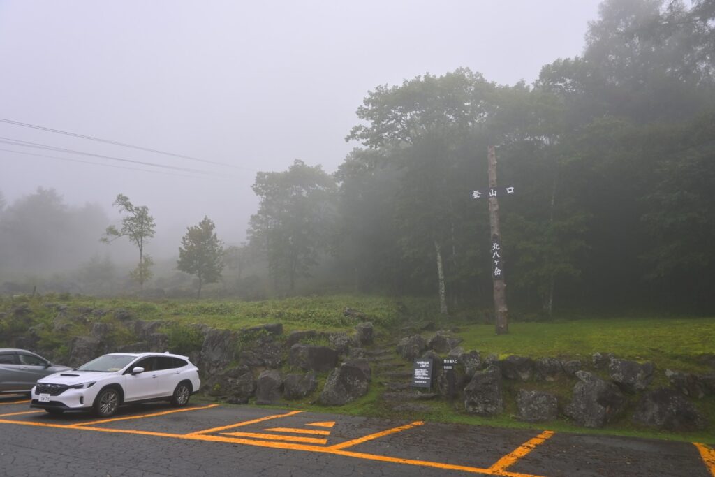 朝方まで雨の予報なので、起きて天気を見て決める…ができない。天気が回復することを期待しつつ向かいます。雨は早めに上がってくれたけど、八ヶ岳にまとわりつく雲はしぶとそです。ガスガスのロープウェイの駐車場に着きました。しばらくウダウダ。行かないというほどの天気ではないけど、なかなか行く気にならない…。ロープウェイの始発時間の直前に出発しました。本来ならロープウェイで登ってくる人たちよりも先に北横岳に向かいたいとこだけど、今日は無理。