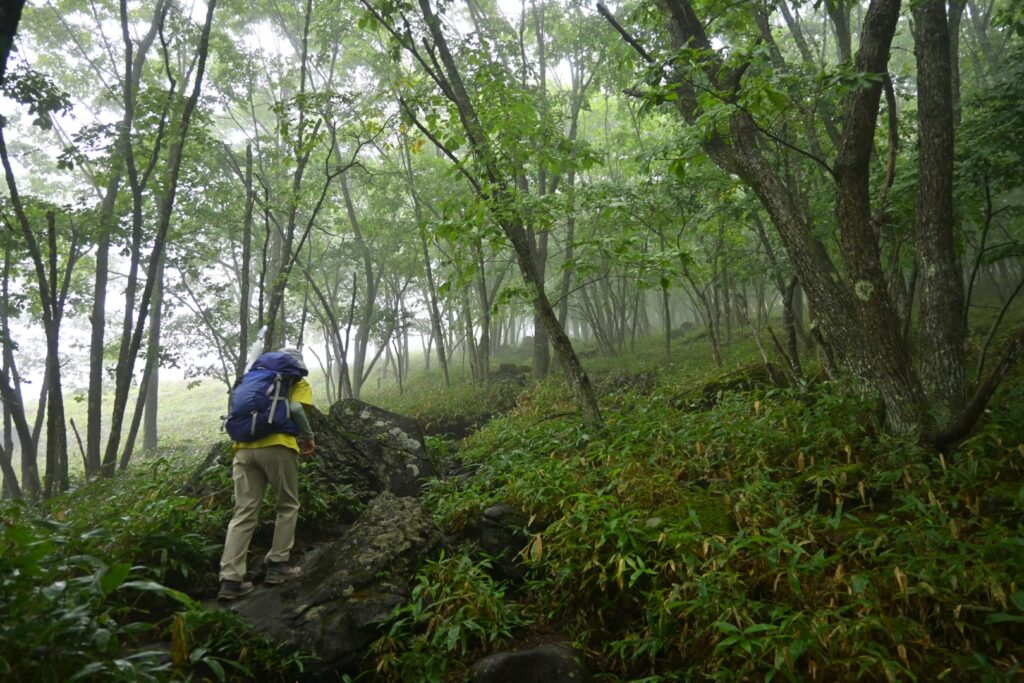 三ッ岳からの下りが激下り。膝が痛いので大変でした。前回は逆コースだったので、ここを登りました。登るほうが楽だな。膝が元気な頃はどってことないんですけどね~。激下りのあとは雨池山に登ります。こちらは穏やかで明るい笹の道。雨池山から雨池峠までも比較的穏やかな下りで助かりました。