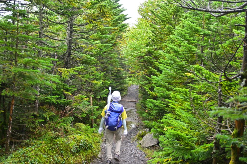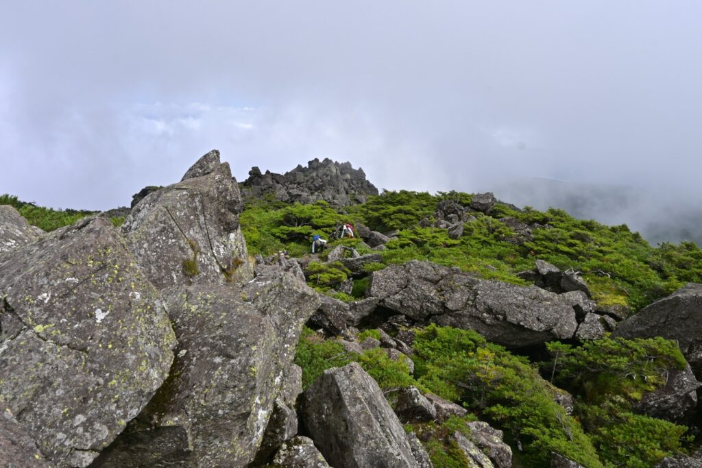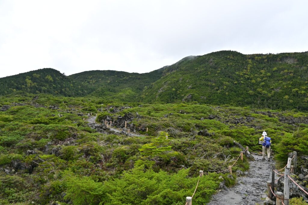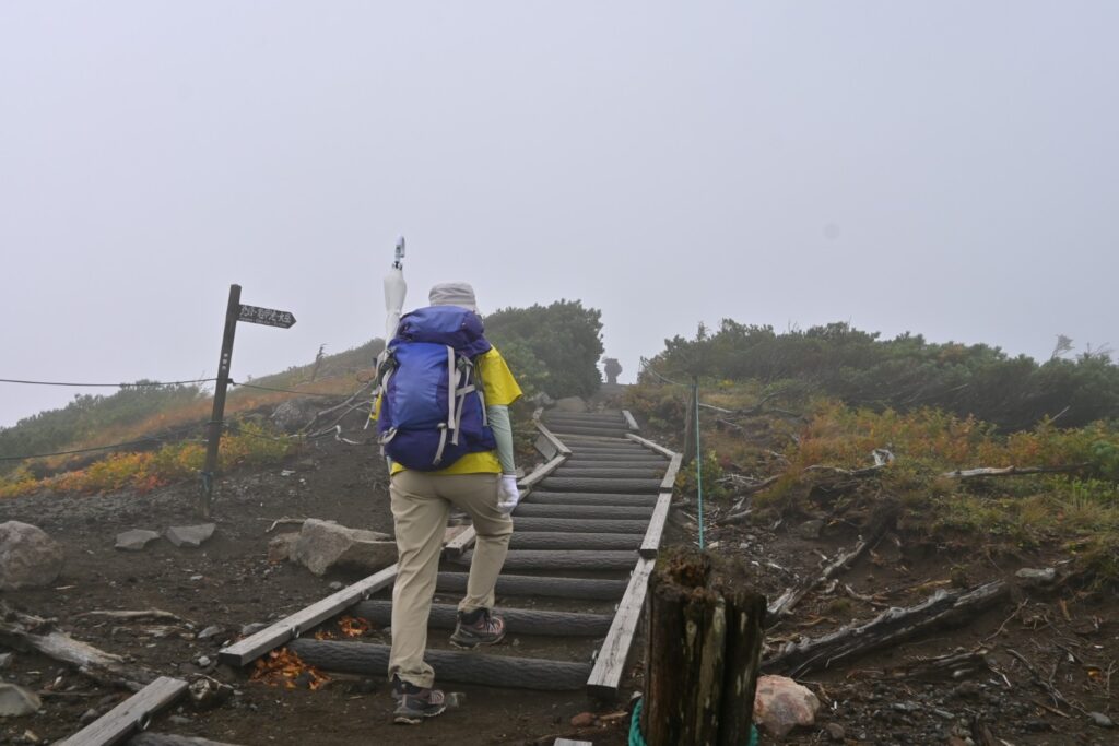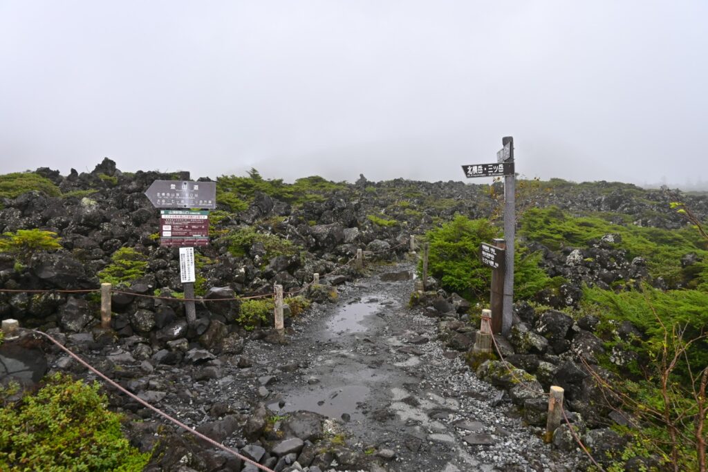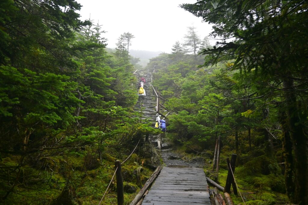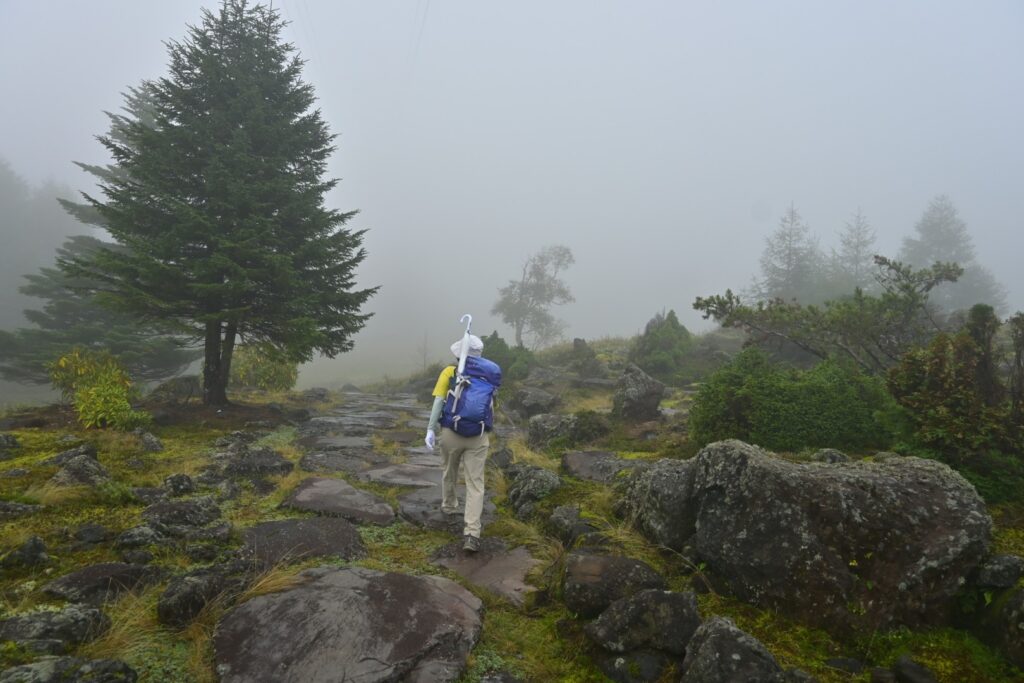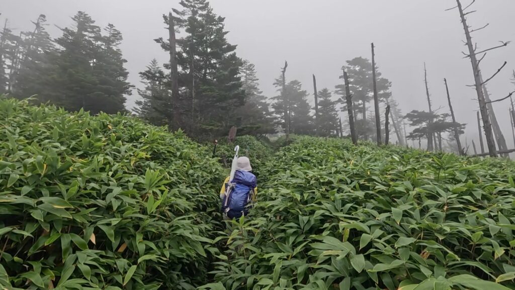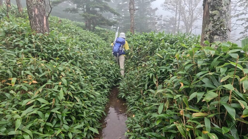 ロープウェイの区間を歩くのは2年前の12月以来。その時はなんともなかったと思うけど、今回は笹被りがひどかったです。とくに後半。雨で濡れてるし、道は水たまりが多いんですが、笹が被ってて道が見えない。ロープウェイで往復した方がよかったです。天気はずっとガスガス。