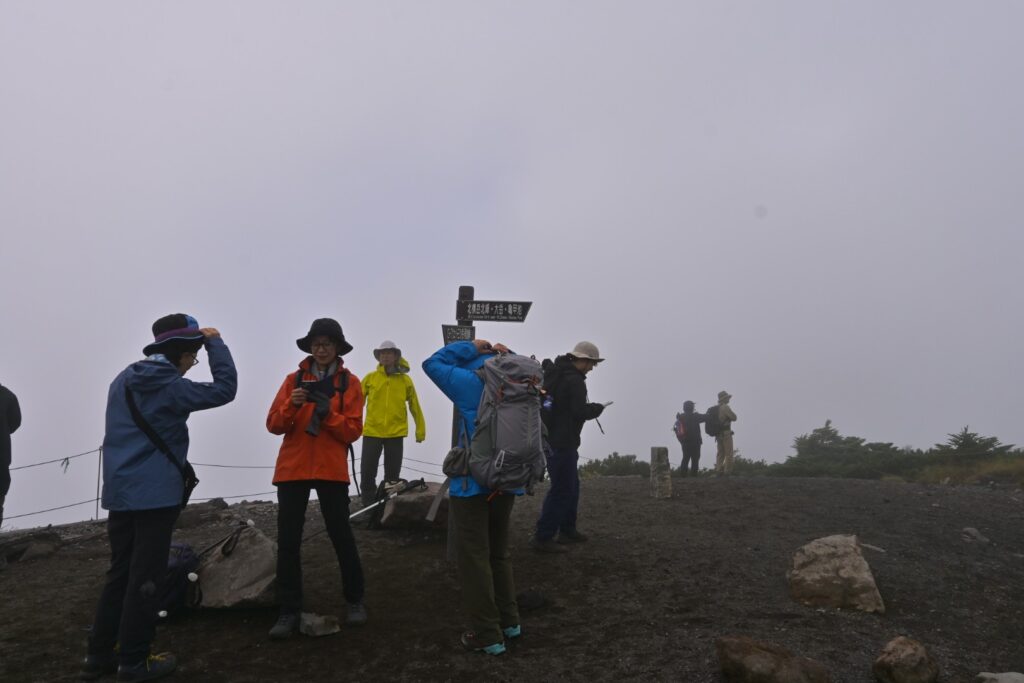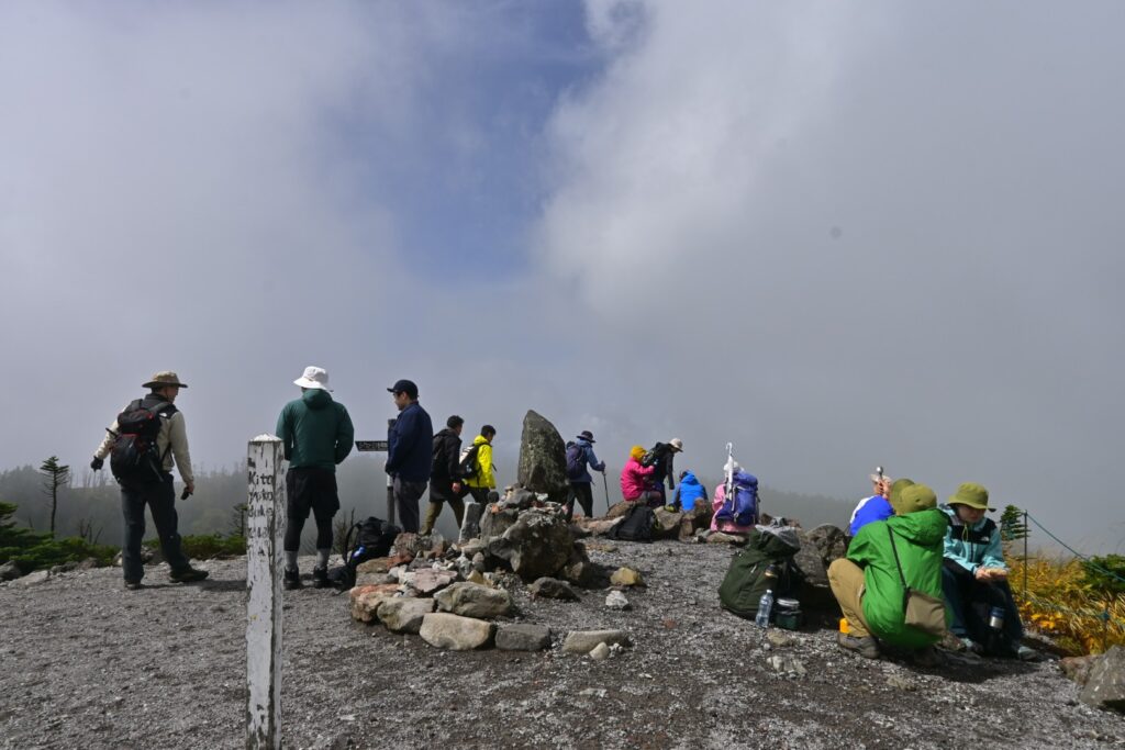 ほぼガスガスですが、たまーーに思わせぶりな青空がのぞいたりしました。その青空の穴と太陽が重なった時には日も射したり。一応回復傾向な予報なので微かな期待はしてしまいますね。北横岳の南峰ではガスガス。ガスの薄い部分もあるけど、展望が得られるような雰囲気はナシ…。
