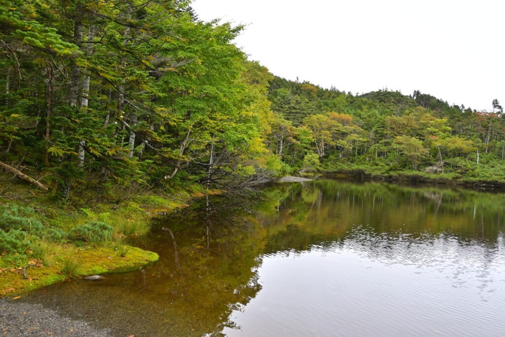 北横岳をあとにし、北横岳ヒュッテのとこから七ッ池に立ち寄ります。2年前に来た時は12月なので当然雪で埋まっててただの雪原。どんな池なのかは気になっていました。ショボい池だろうなと思ってたら、まあまあ風光明媚な池でした。バックに北横岳もあるし、全体の雰囲気もよかったです。紅葉する木も少ないけどあったので、来週か再来週あたりがいい感じかな。