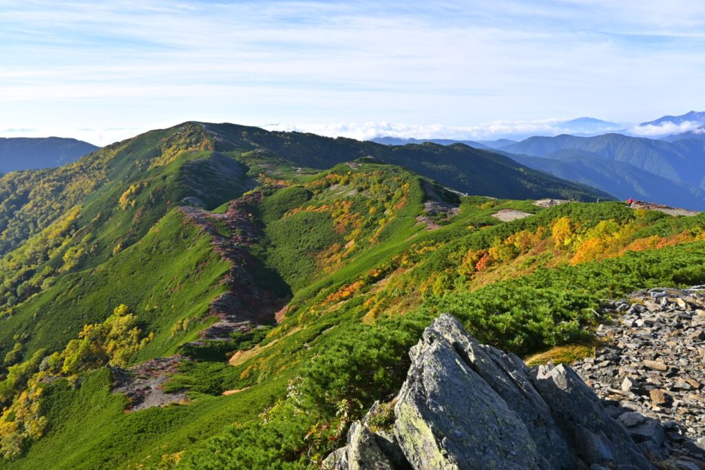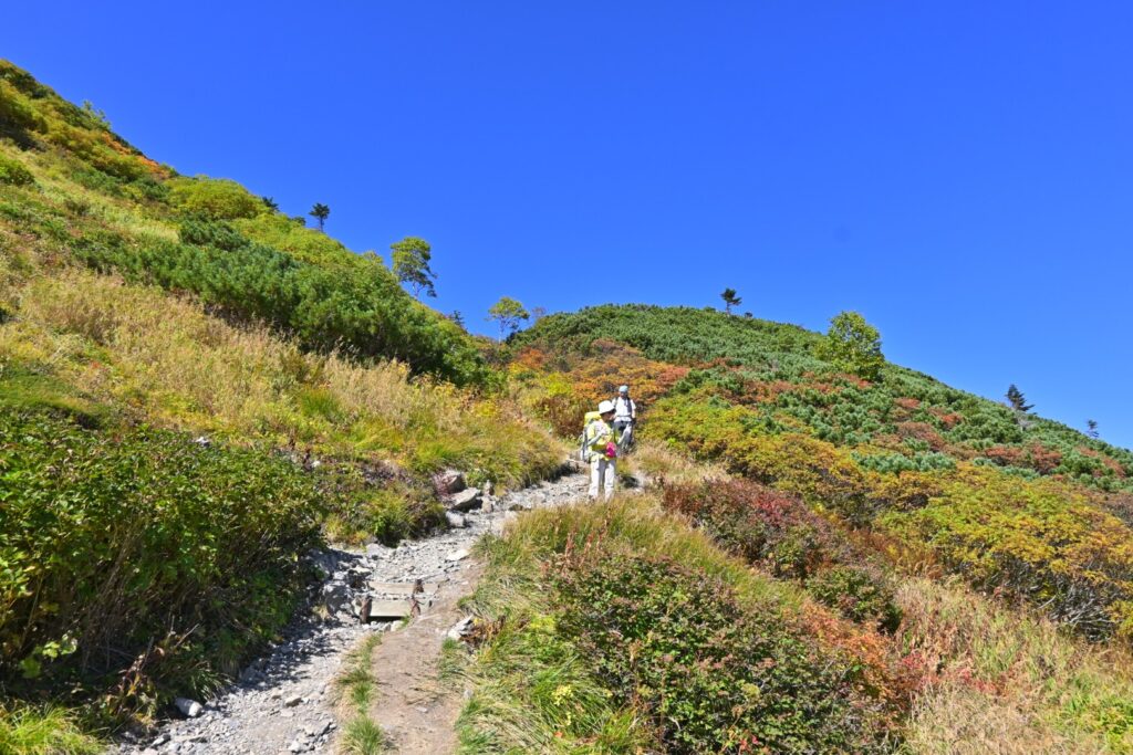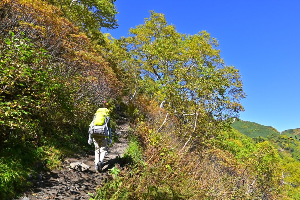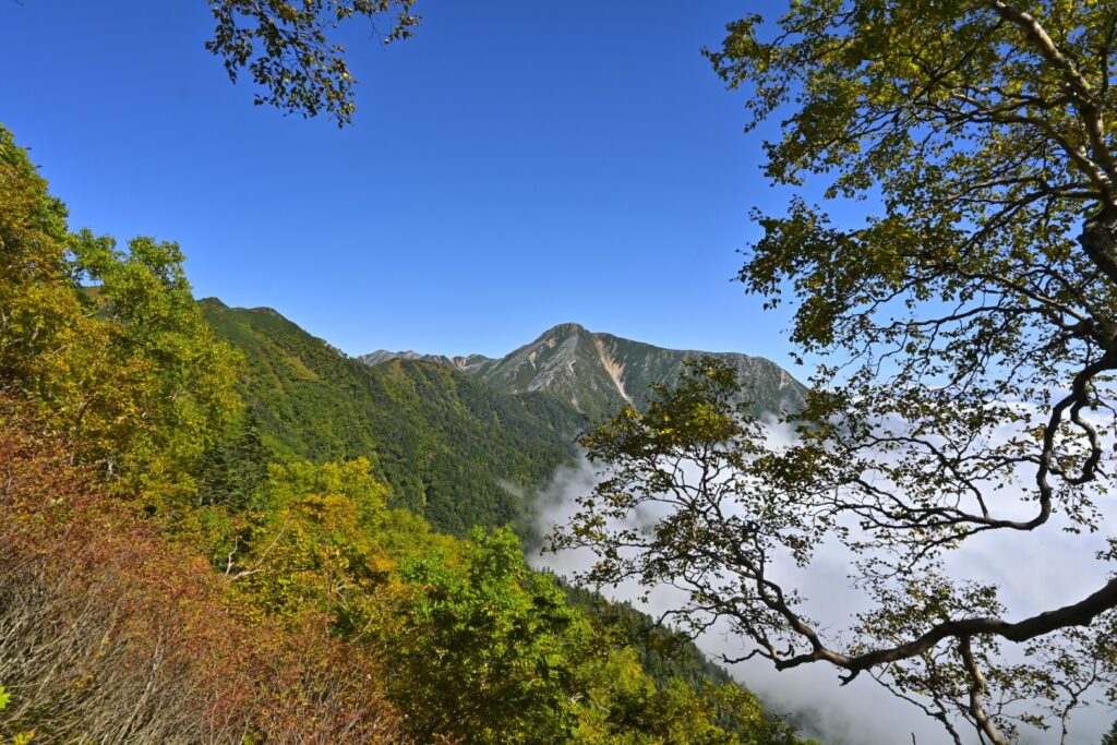 蝶ヶ岳というか常念山脈は稜線にだいぶ近いとこまで針葉樹林帯。黙々と登るのみです。夏でも涼しいのが唯一の利点。でも、今日は蝶沢を渡る頃から針葉樹の下草のように生えてる広葉樹が紅葉してました。夏は緑の葉っぱなので紛れてますが、紅葉すると明るくなって目立ちます。黙々とは登ってましたが、結構楽しく登れました。