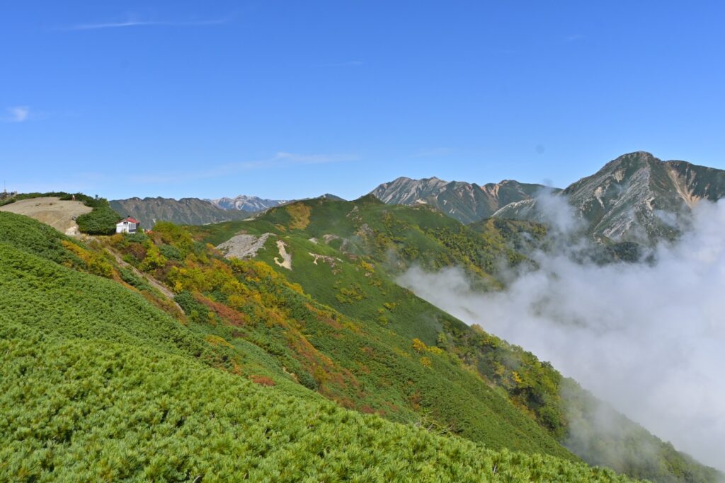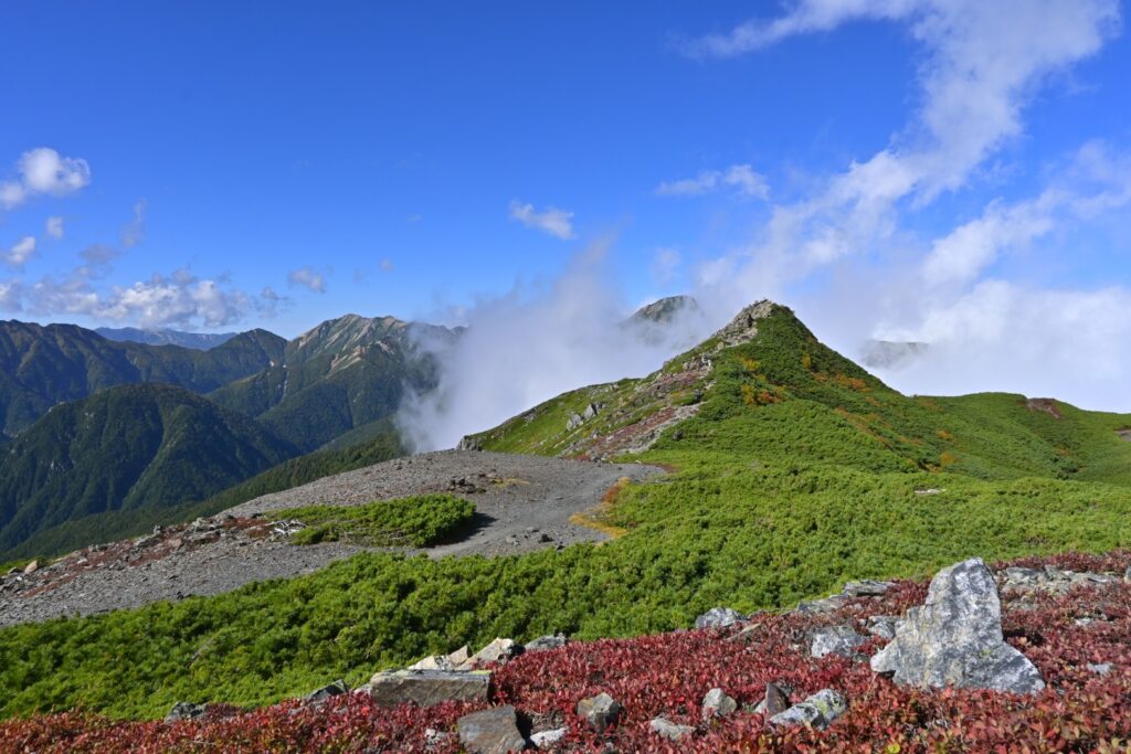 稜線は草紅葉してますが、蝶槍への稜線は花は少なくてハイマツが主。なので、草紅葉になってるのが部分的です。稜線の安曇野側の灌木が紅葉しててキレイでした。蝶槍に着きましたが、常念岳との間の落ち込む部分の雲に勢いがあって、常念岳はかろうじて山頂が見える程度。前常念は雲に隠れちゃってます。