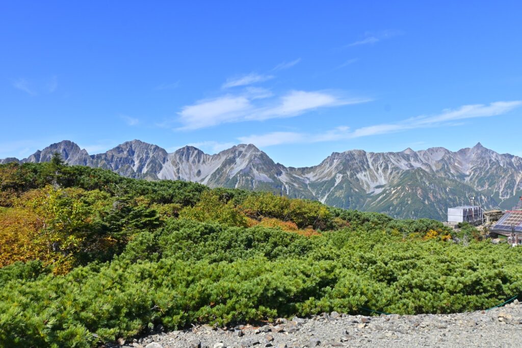 灌木の紅葉のトンネルを抜けると大滝山の分岐。ここまで来るともう着いたようなもん。夏はお花畑になるところ、今は草紅葉になってます。草紅葉というよりも、枯れ草が生えてるって感じで茶色が中心でした。周囲の広葉樹は良い色に染まってます。そして、ハイマツのトンネルを抜けると『槍穂高ドーン!』ということになるのであります。
