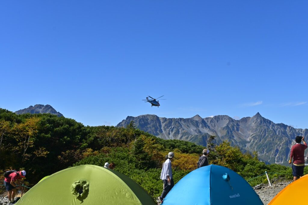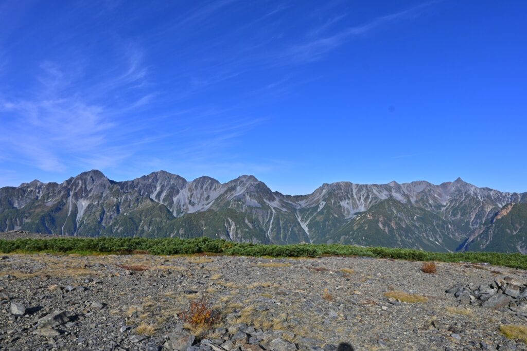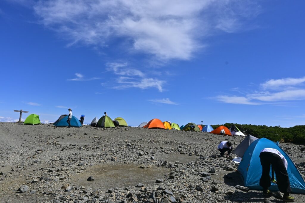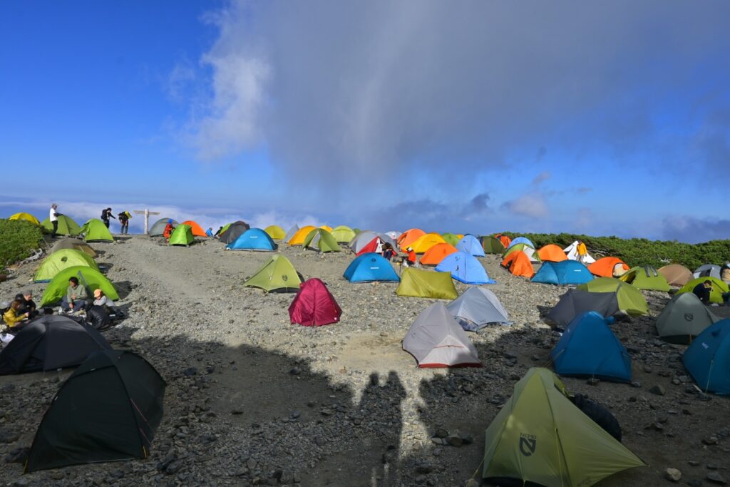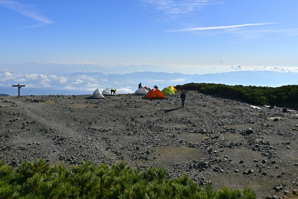 蝶ヶ岳の稜線に出る瞬間というのは、何度登ってても感動しますね。でも、一番最初に登った時の予備知識のない『槍穂高ドーン!』が一番度肝を抜かれたんだと思います。とりあえずチラッと槍&穂高を見てテン場へ。時間は10時。まだガラガラで選びたい放題です。登山道に近い小高くなったスペースが人気のようで、そこらへんから埋まってだんだん奥の方に広がる…って感じでした。