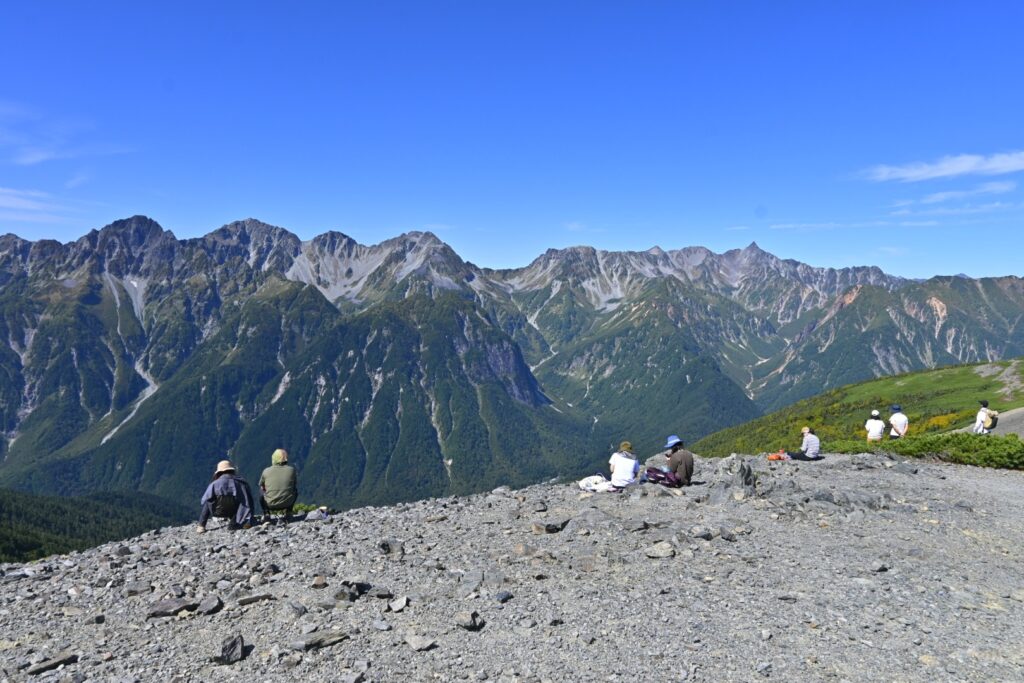 蝶槍から少し戻った広い丘のようなピークに蝶ヶ岳の三角点があります。ここでまたのんびりします。広い砂礫の先に槍&穂高が生えてるように見えます。槍&穂高を見るには瞑想の丘からと、この三角点からが良いのかなと思いました。ま、どこからの景色も素晴らしいんですけどね。
