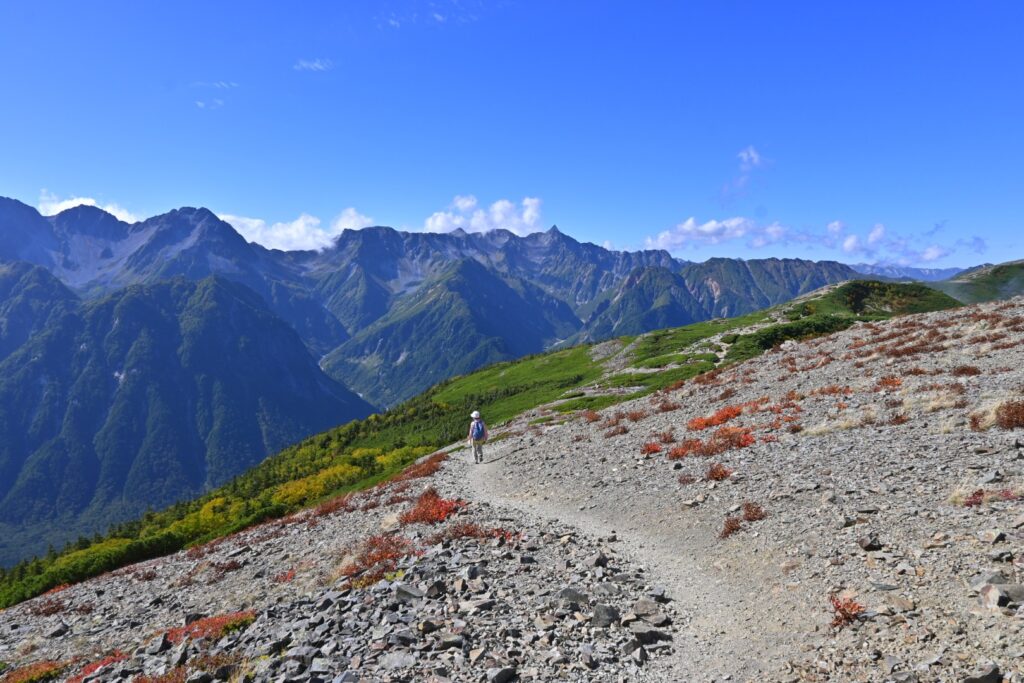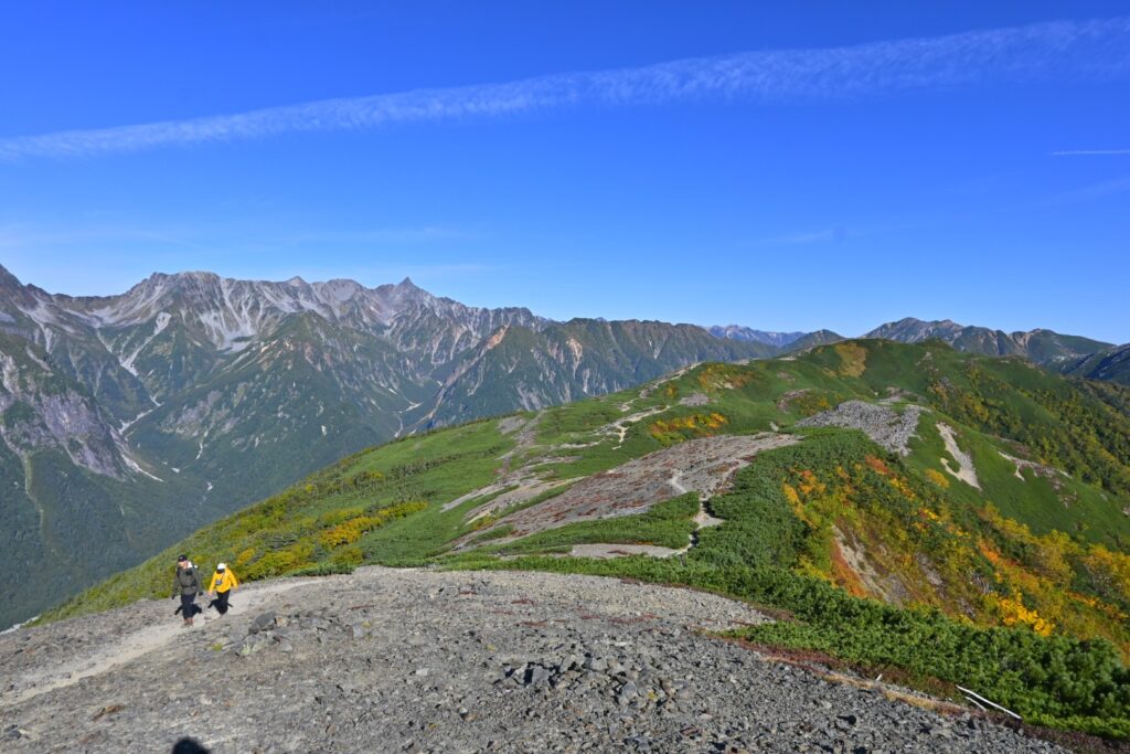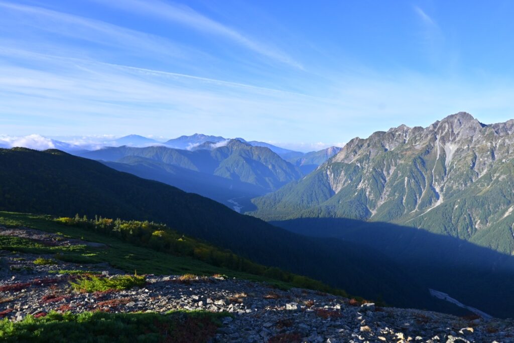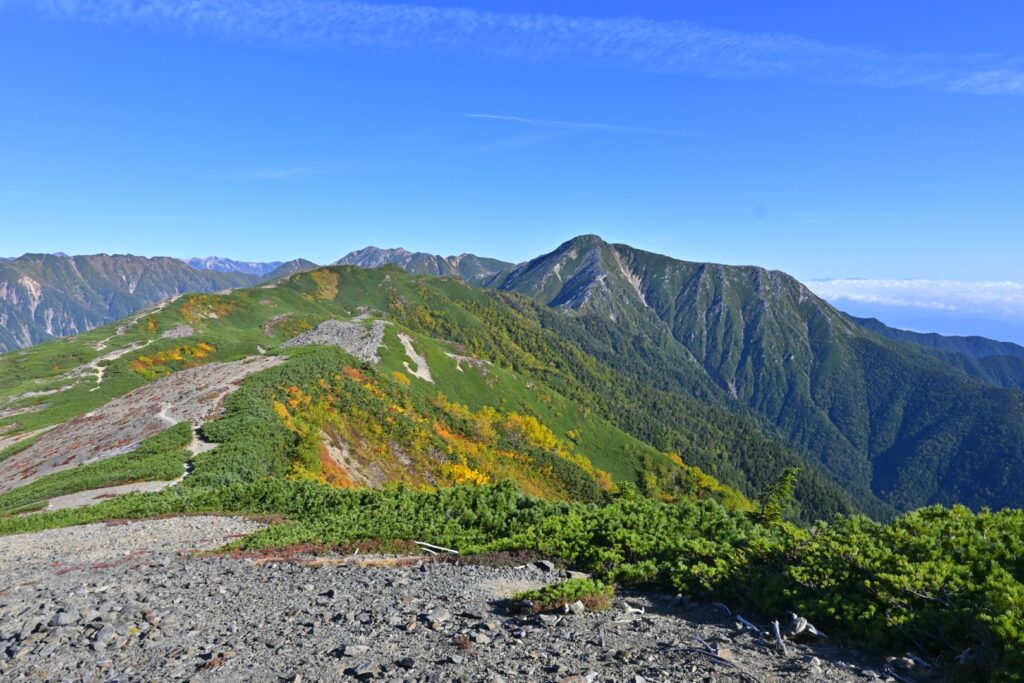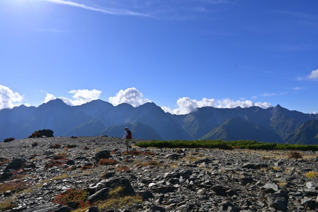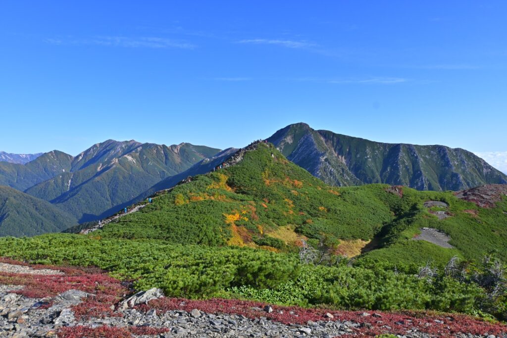 蝶ヶ岳の山頂(最高点)に向かって、山頂の少し手前で長塀尾根の道に向かいます。徳沢へと下る道ですね。ハイマツの間を縫って下ってると、絶景が突然目の前に!少し下が二重山稜のくぼ地になってます。夏はお花畑になるところ。そのお花畑の周囲を縁取るように灌木が紅葉してます。バックには穂高連峰や焼岳、乗鞍岳…などなど。