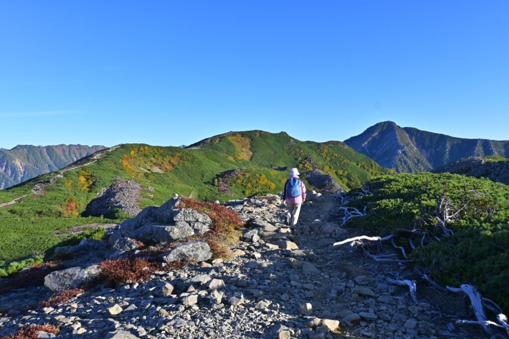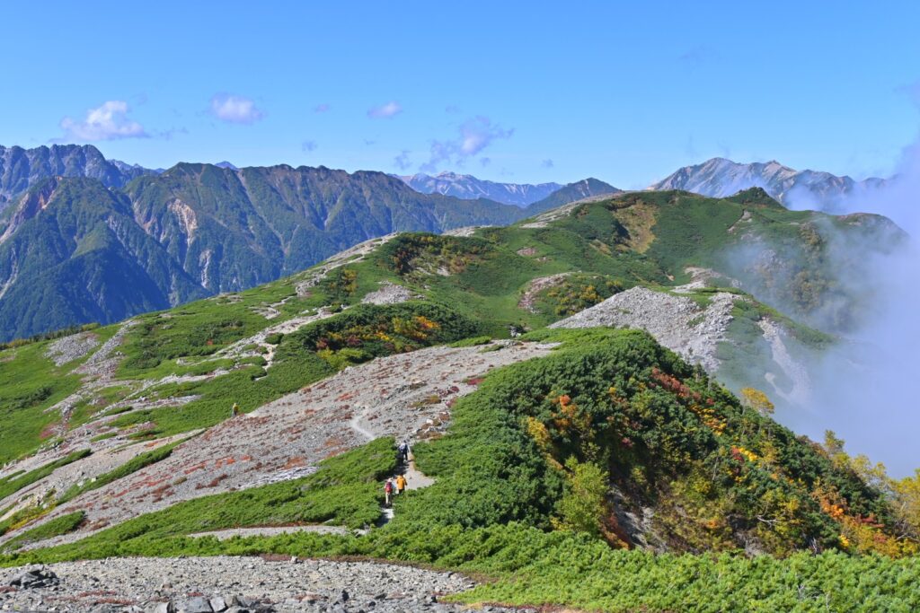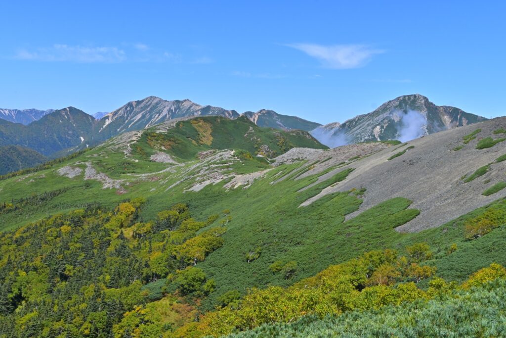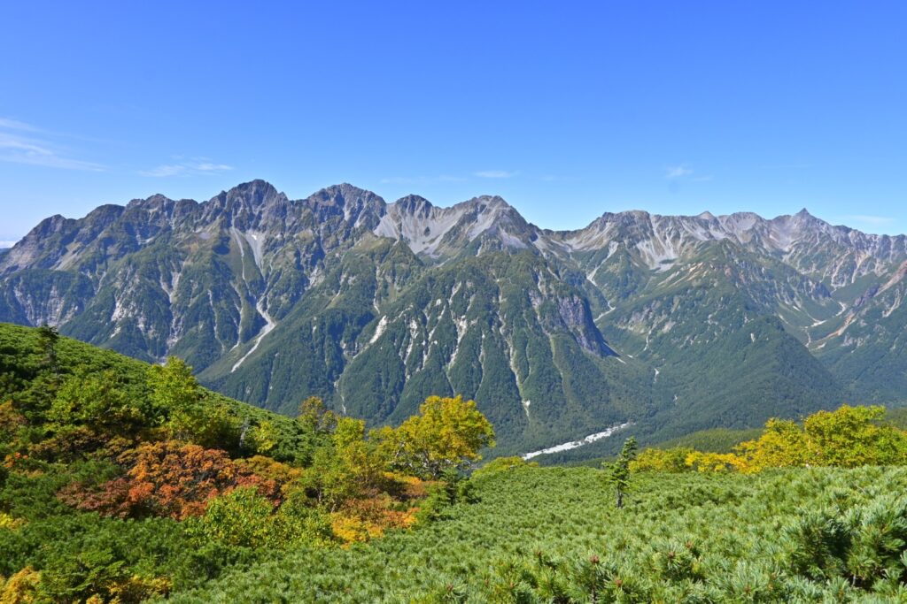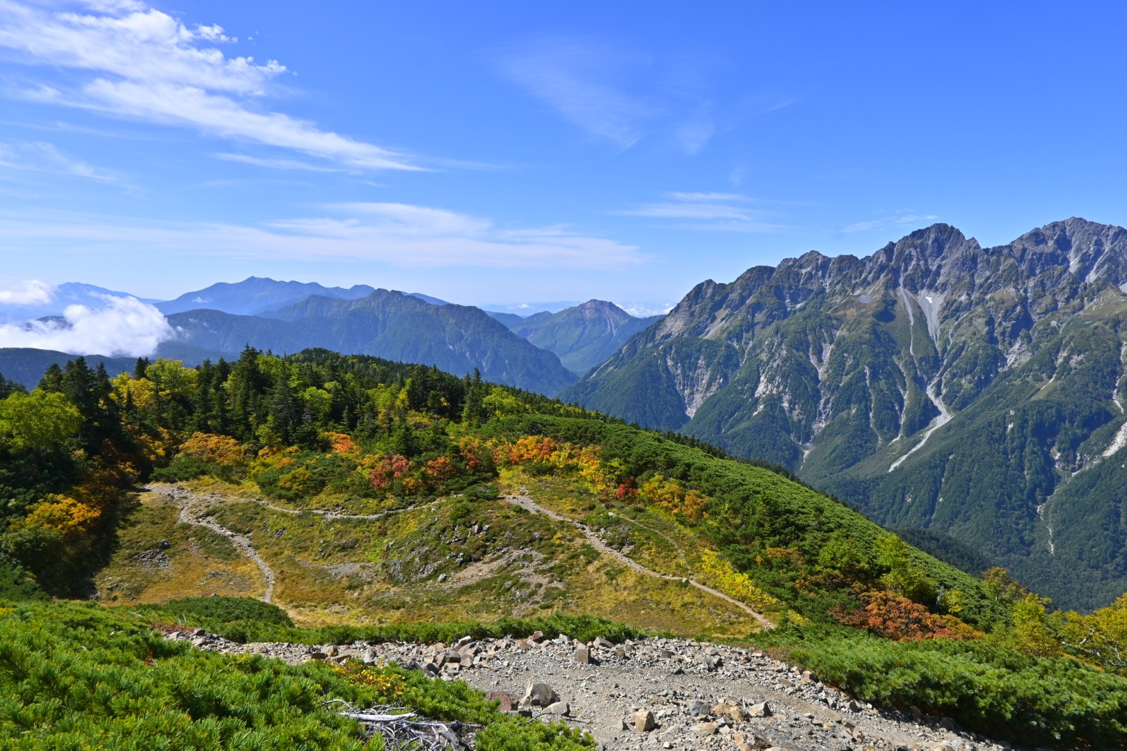 蝶ヶ岳の山頂(最高点)に向かって、山頂の少し手前で長塀尾根の道に向かいます。徳沢へと下る道ですね。ハイマツの間を縫って下ってると、絶景が突然目の前に!少し下が二重山稜のくぼ地になってます。夏はお花畑になるところ。そのお花畑の周囲を縁取るように灌木が紅葉してます。バックには穂高連峰や焼岳、乗鞍岳…などなど。