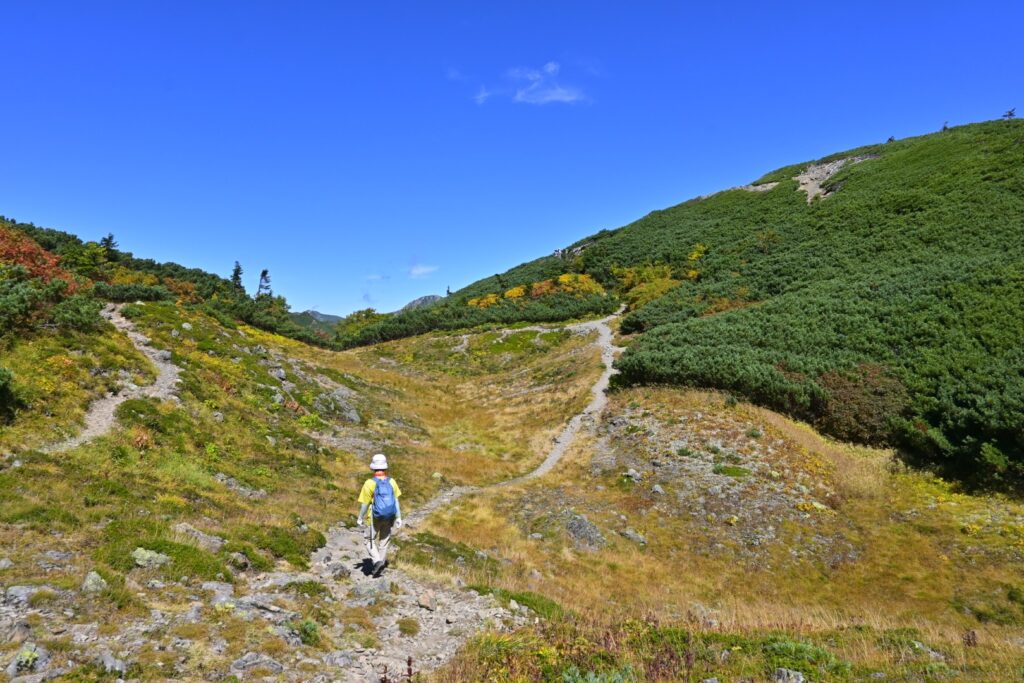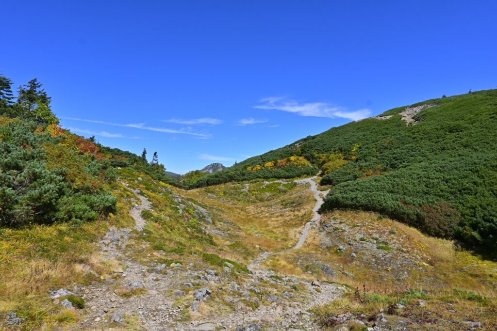 さて下ります。下りになると途端に膝が痛くなる今日この頃。妖精の池や蝶槍の散歩のときは荷は軽いし気を付けて歩いて、膝の痛みは鳴りを潜めてました。しかし、重いザックを背負って下り始めると、間髪入れずに膝の痛みが出てきました。やれやれ、長い下山になりそうです。