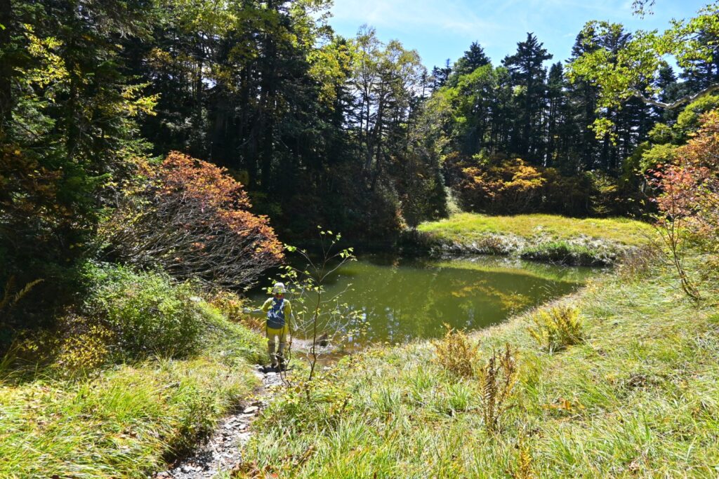 そこから少し下って樹林帯に入ったところに妖精の池があります。ロケーションも水もあんまりキレイではないです。なんで妖精…?サンショウウオがたくさんいたけど、それが妖精なのかなあ?そんなにキレイではないけど、紅葉する木も混じってて夏よりは明るかったです。