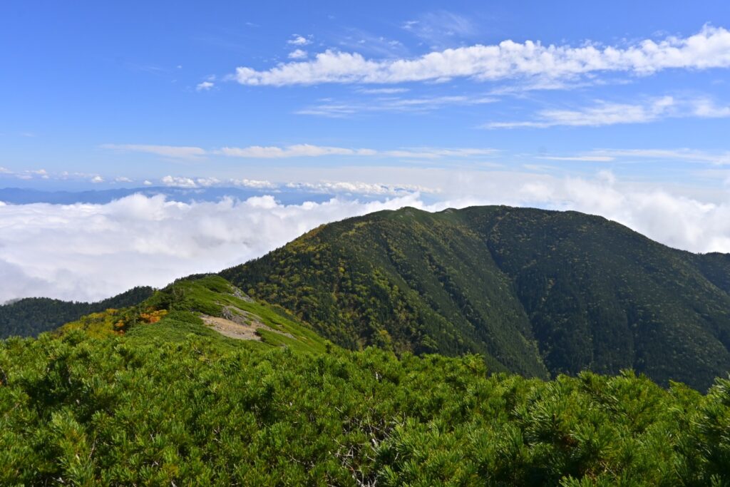 蝶槍までやってきました。常念岳は依然として丸見え状態。常念岳へと続く稜線もバッチリ見えています。蝶ヶ岳から常念岳を縦走するとき、蝶槍からの大下りとその後のアップダウンでダメージを受けます。さらに大下り後しばらくはスッキリしない森の中を歩く時間が長いウンザリタイム。しかし、今上から見る限り、スッキリしない森の中に紅葉する木が混じってて明るく見えます。もしかしたら、秋はわりといい感じなのかもしれないと思ったのでした。