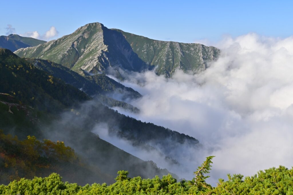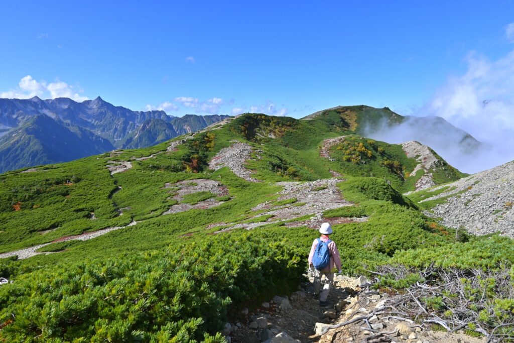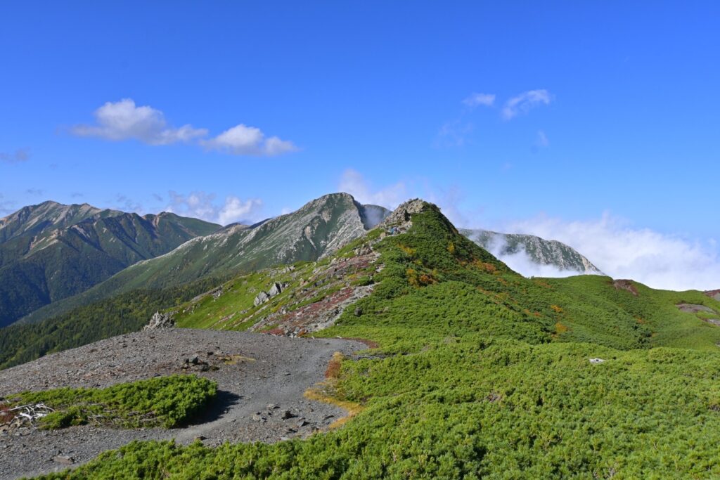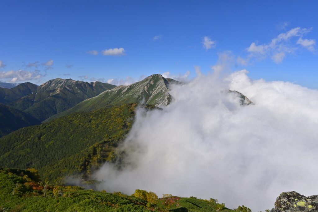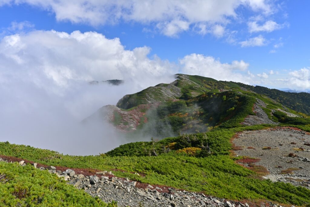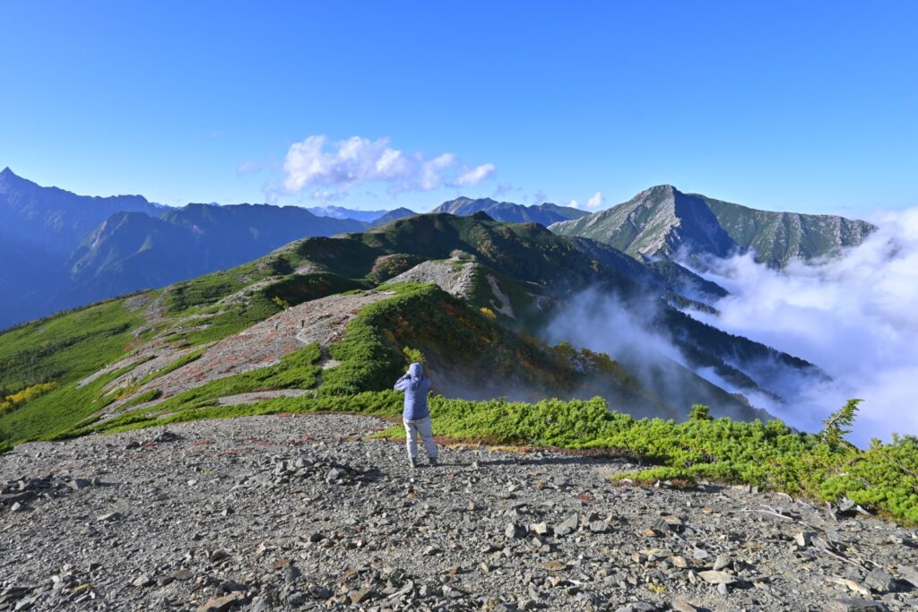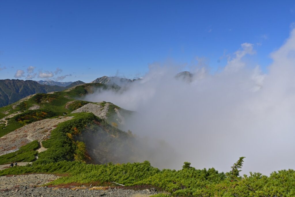 休憩して復活。蝶槍に向かいます。のんびりのんびり向かいます。安曇野側に沸いていた雲は稜線にまで押し寄せてきてます。もはや雲海ではなく、稜線にかかる雲です。ただ、稜線を越えてくることはなく、槍&穂高方面は依然として快晴であります。瞑想の丘あたりで、その雲海の様子をタイムラプスに収めました。果たして何が写ってるか…?