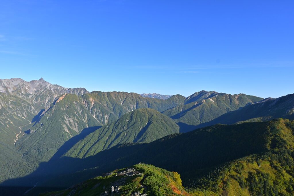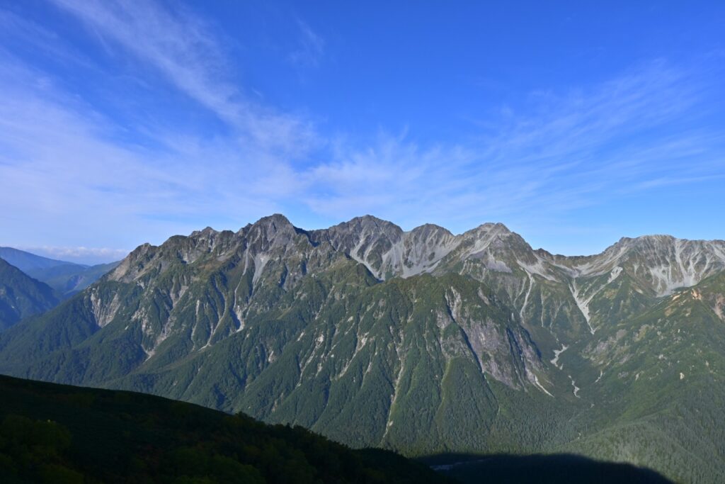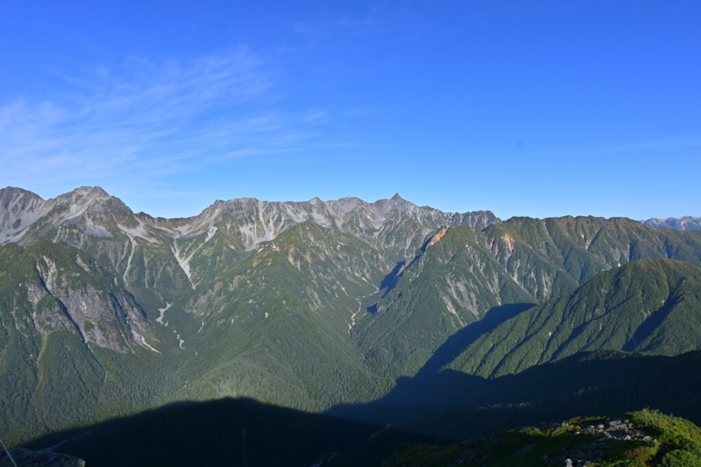 朝早いのでまだ太陽が低いです。蝶ヶ岳の稜線も西側は陰ってる部分が多いです。その意味では稜線歩きは太陽が高くなってからの方が良さそうな感じです。また、槍&穂高も真正面から太陽を浴びるので、陰影がほとんどありません。昨日のお昼ごろは陰影がハッキリしてて立体的でした。ただ、今日は安曇野側からの雲がなくて常念岳も丸見えです。