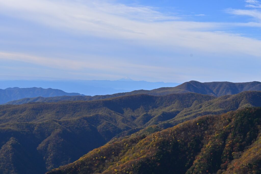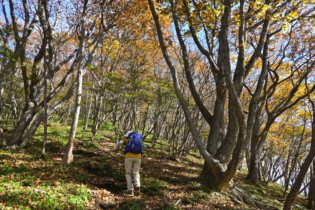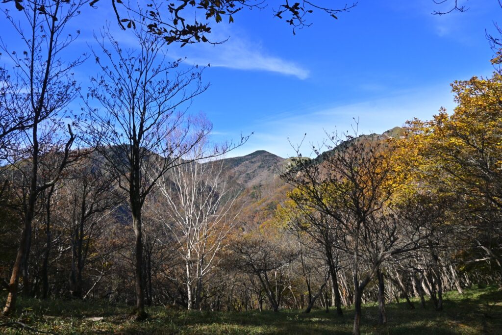 紅葉の方ですが、稜線は終了間際で下の方はまだまだこれから。中間が盛りかと言うとそうでもなく、よくわからない感じでした。稜線の少し下あたりミズナラ?の黄葉が見頃と言えばそうだったかもしれません。中倉山と沢入山の間の松の木沢側の斜面に点々とツツジが紅葉してるのが見えました。俗にいう『赤い羊』。もう終わりかけだったけど、真っ赤っかの時はどんなだっただろう…?