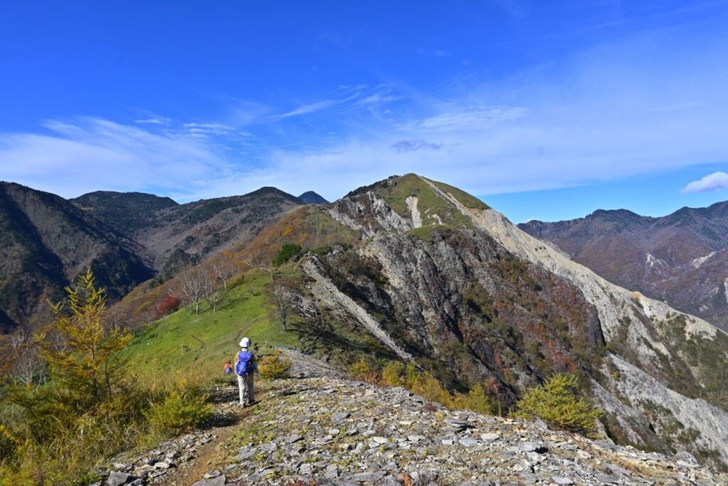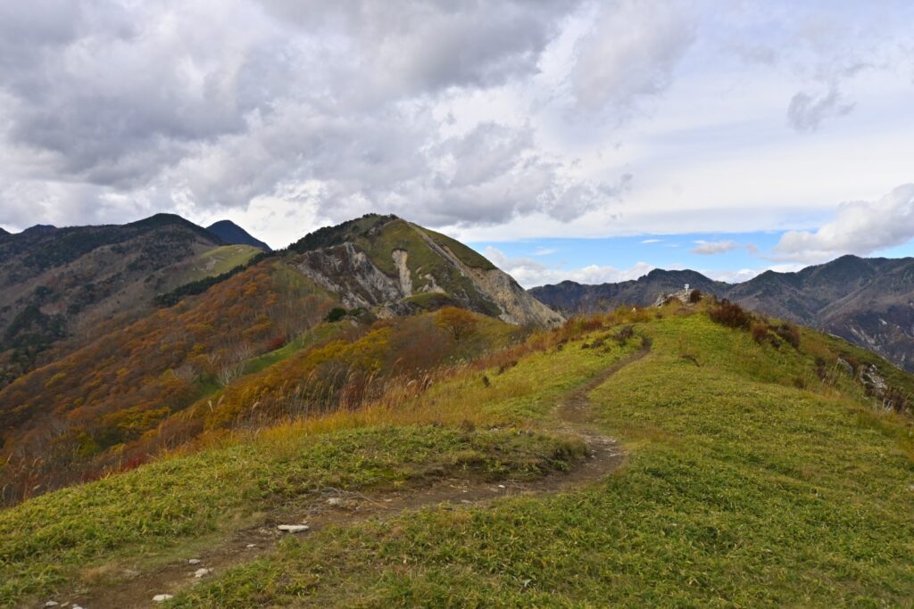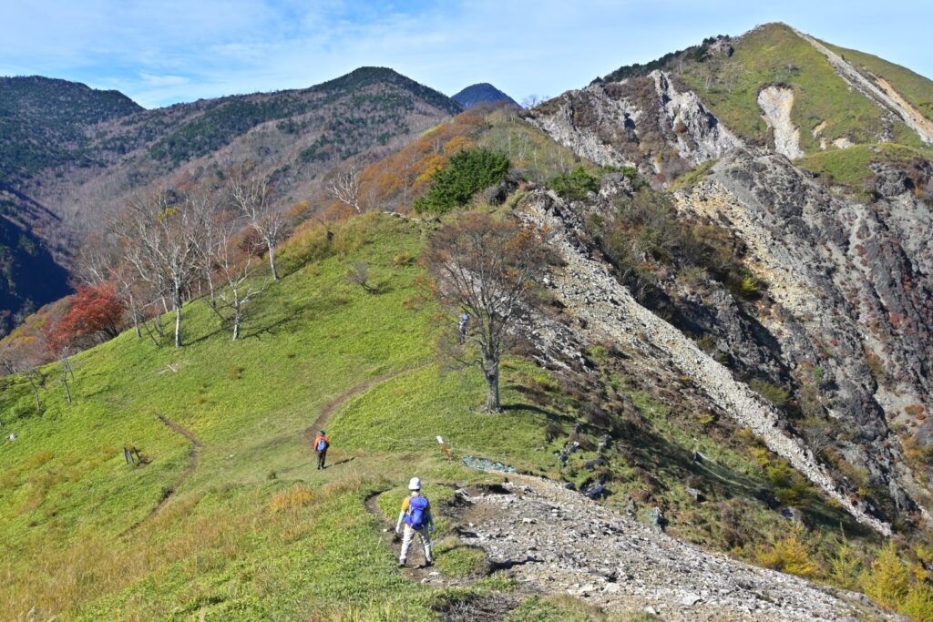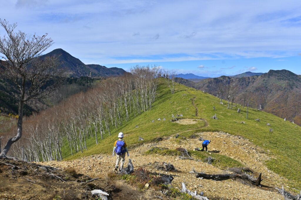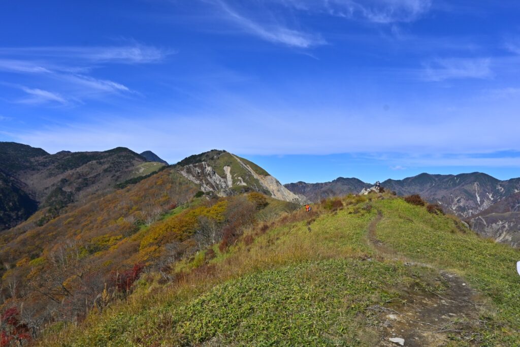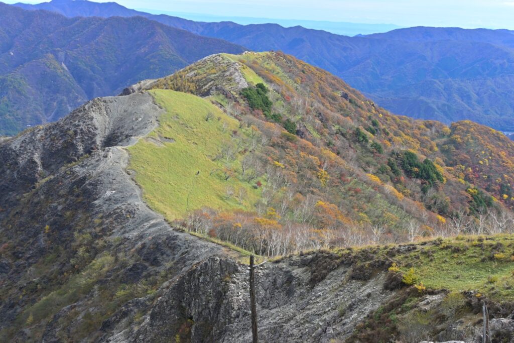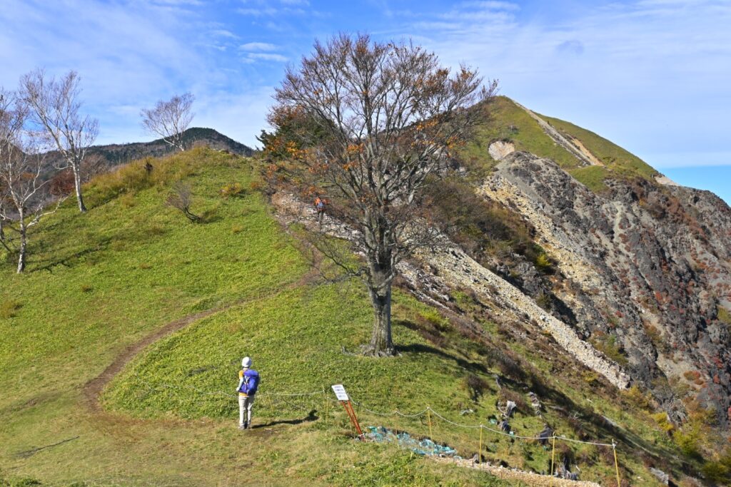 左には笹が生えてて、その中にポツリポツリと中くらいの木が生えてます。のどかな風景です。対して右側はほとんど木の生えない殺伐とした岩肌の続く斜面。左右の対比が極端です。稜線は緩くアップダウンを繰り返します。展望が素晴らしいので登りが苦になりませんね。登ってることにも気付かないくらいでした。