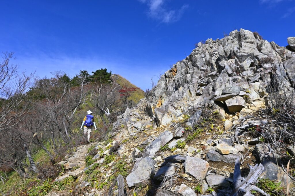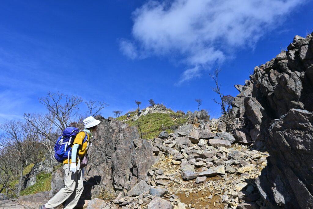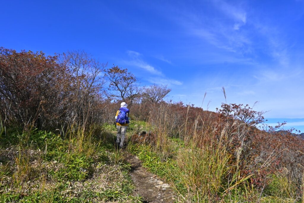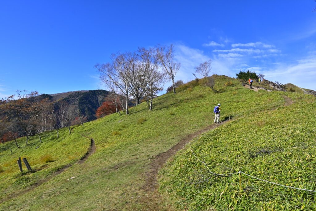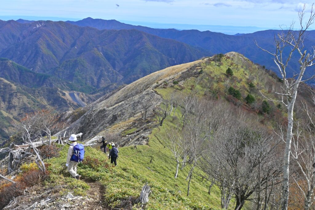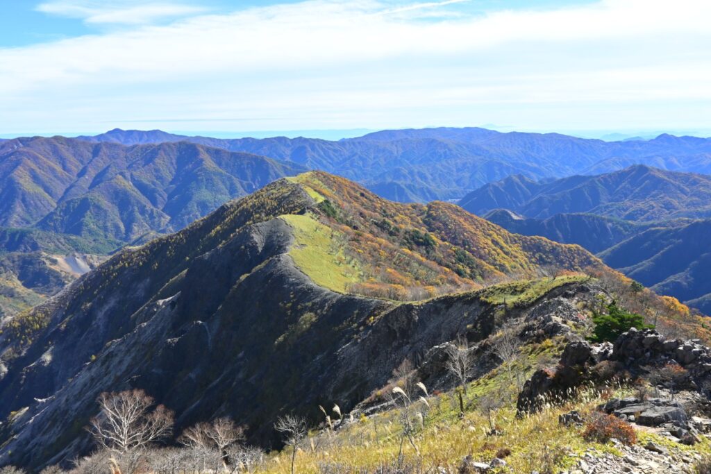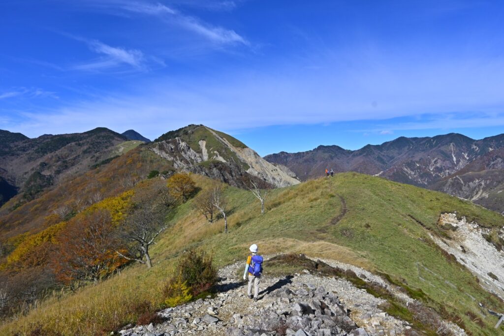 左には笹が生えてて、その中にポツリポツリと中くらいの木が生えてます。のどかな風景です。対して右側はほとんど木の生えない殺伐とした岩肌の続く斜面。左右の対比が極端です。稜線は緩くアップダウンを繰り返します。展望が素晴らしいので登りが苦になりませんね。登ってることにも気付かないくらいでした。