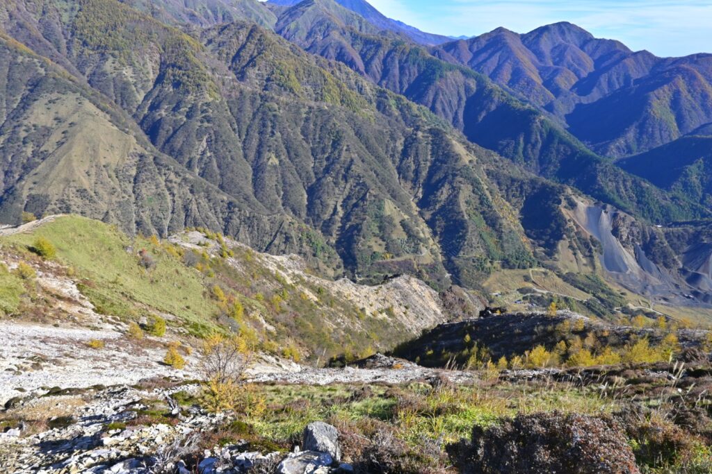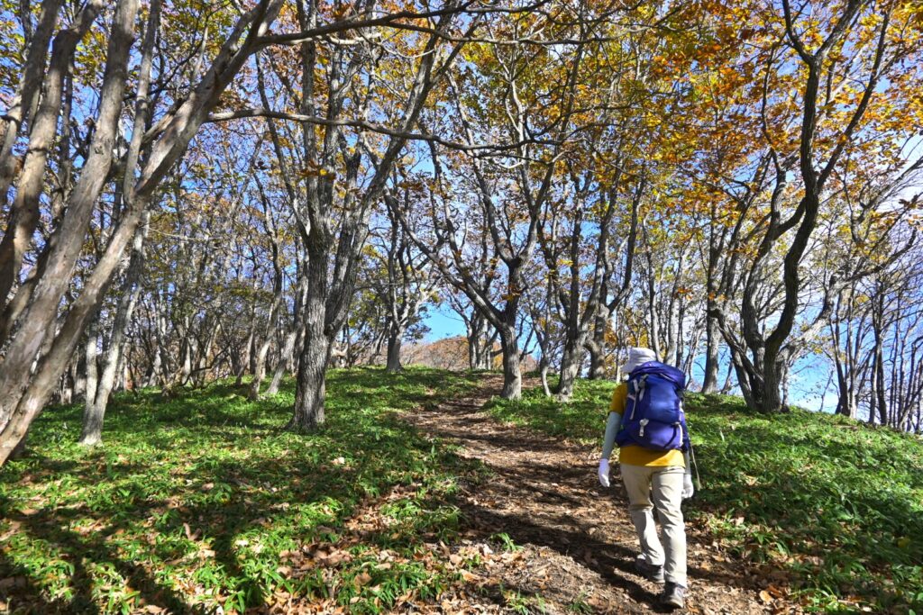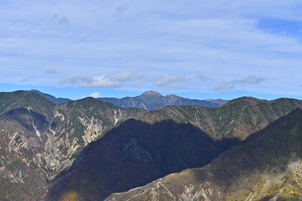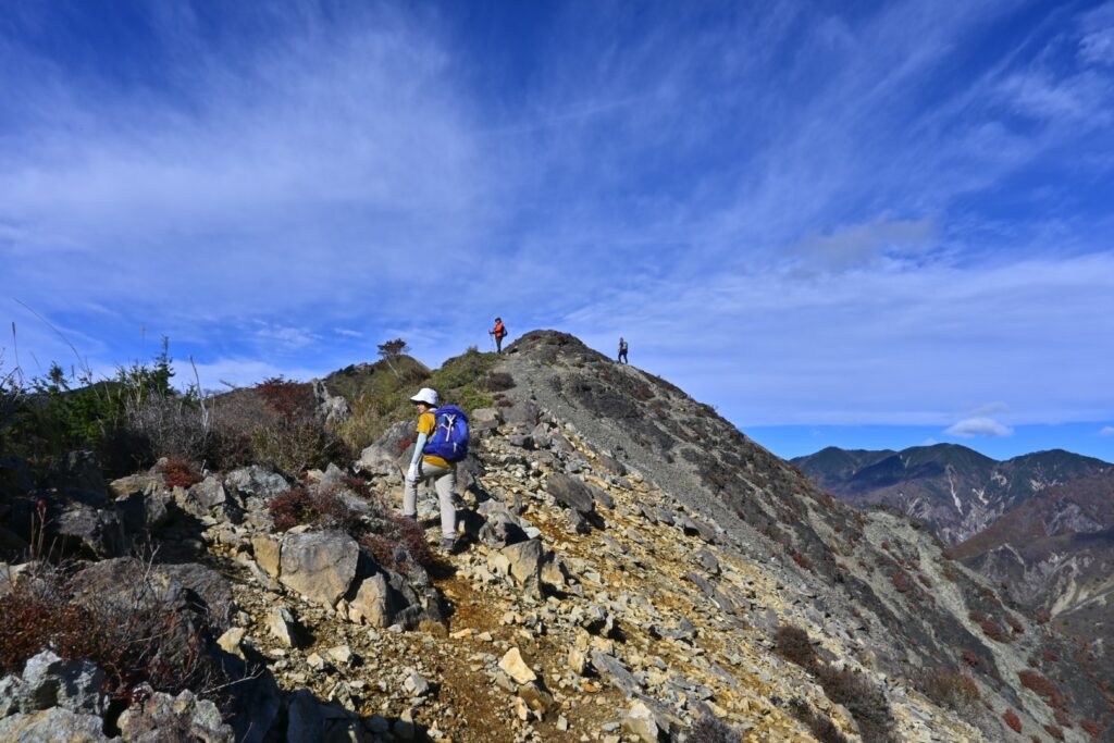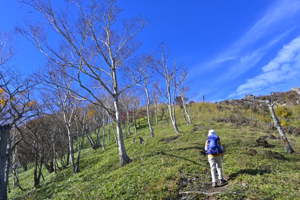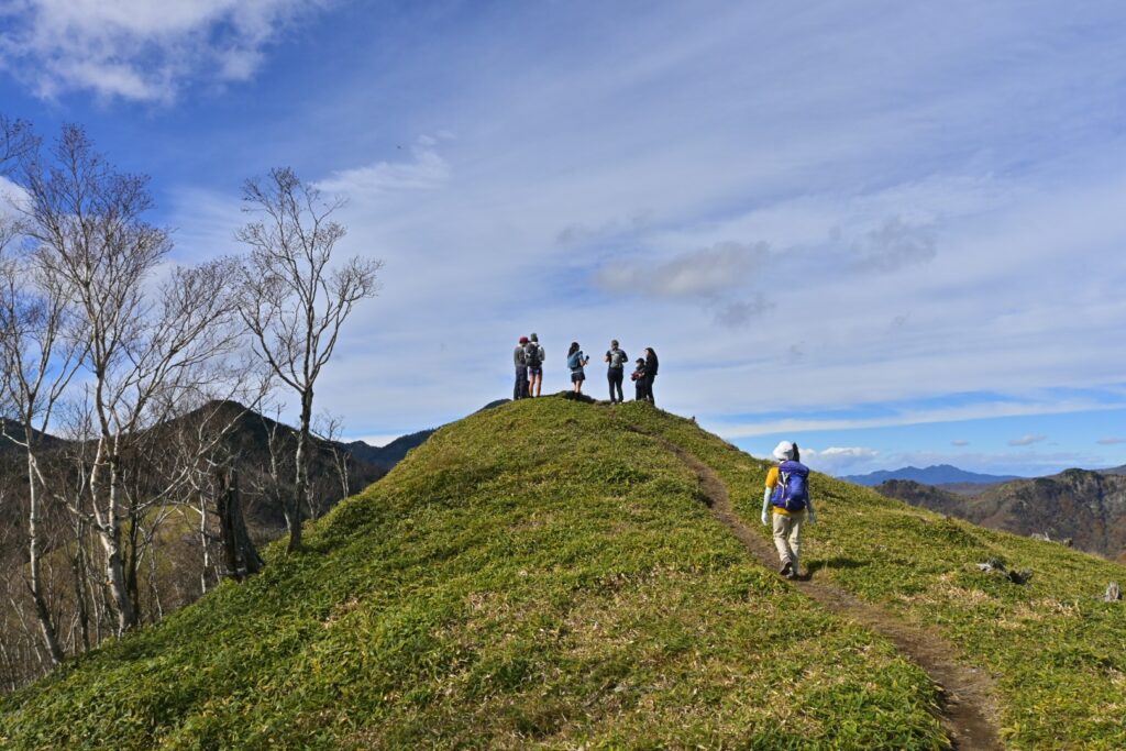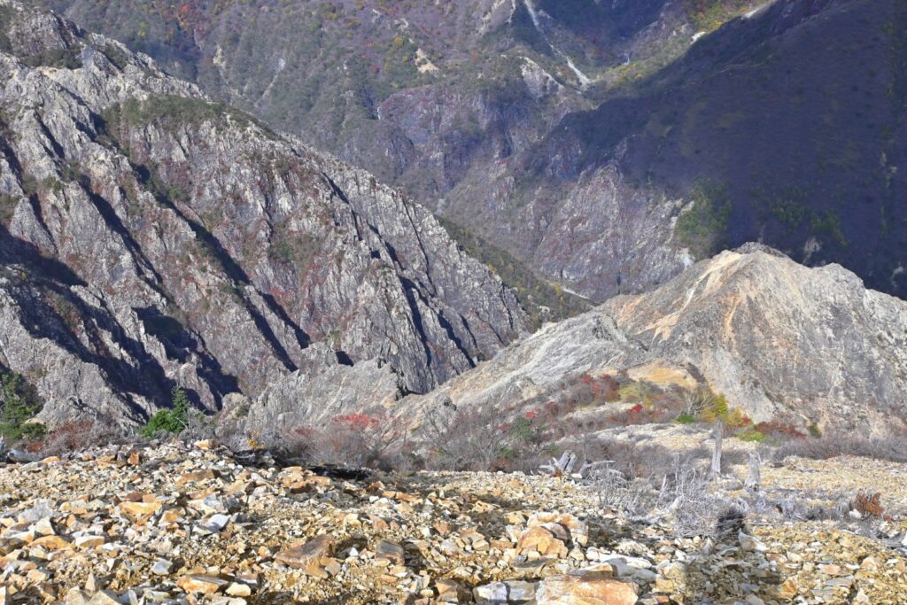 左には笹が生えてて、その中にポツリポツリと中くらいの木が生えてます。のどかな風景です。対して右側はほとんど木の生えない殺伐とした岩肌の続く斜面。左右の対比が極端です。稜線は緩くアップダウンを繰り返します。展望が素晴らしいので登りが苦になりませんね。登ってることにも気付かないくらいでした。