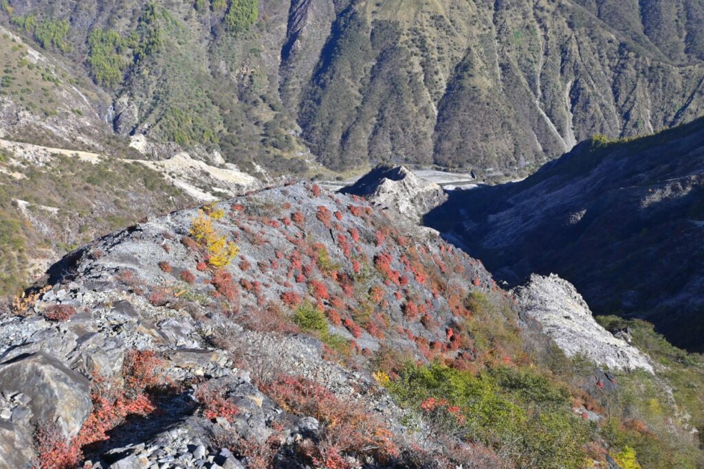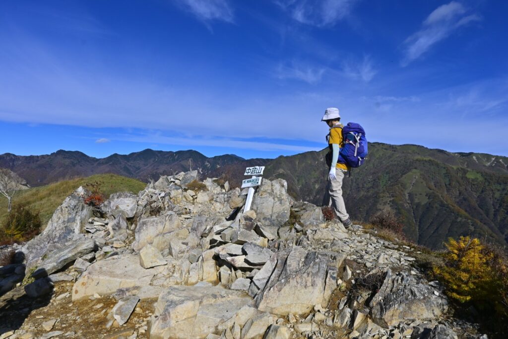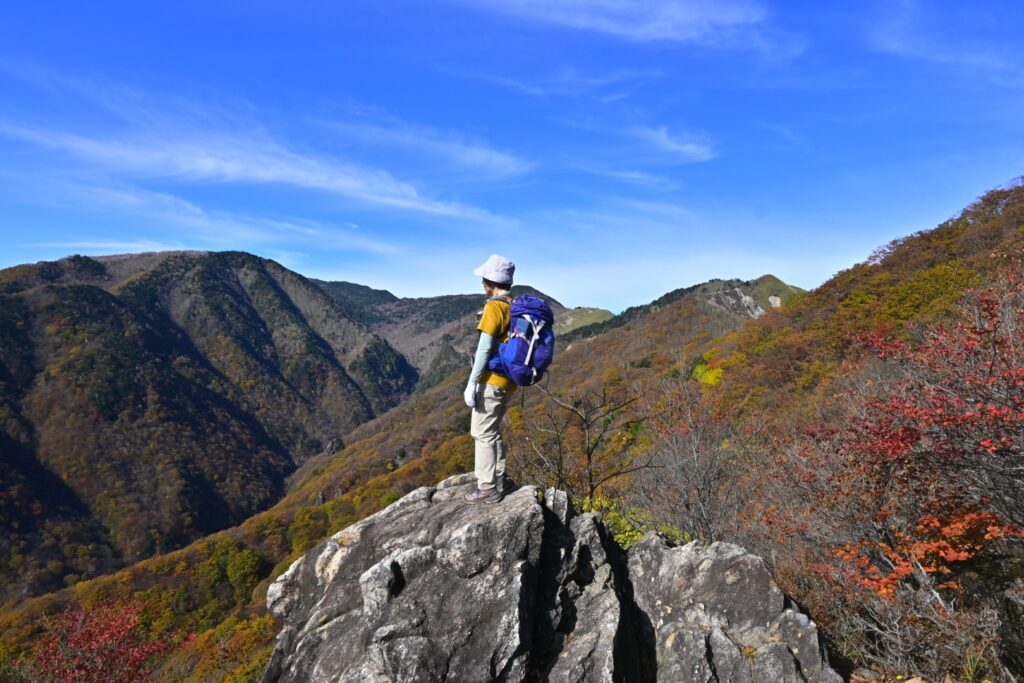 登山口に着くころには既に日差しがギンギンに照り付けてます。ジグザグは付けられてるけど急登続き。朝から半そでです。ちょっとしたコルまではひたすら登る感じが1時間ほど続きました。コルからは尾根になるけど、傾斜が急なのは相変わらず。中倉山直下で直登と巻き道に分岐しますが、ちょうどそこにお立ち台のような岩がありました。紅葉もまずまずで素晴らしい展望です。
