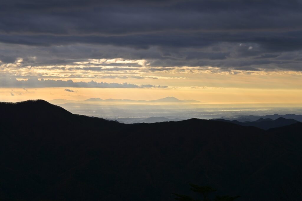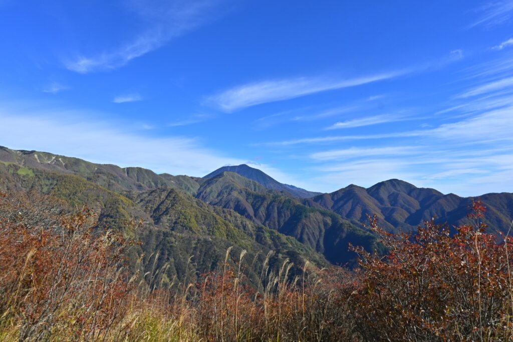 稜線はツツジか何かの灌木が密集。葉っぱはほぼ落ちてて、残り物の葉っぱが残ってます。掻い潜るように道が付いてて、それを抜けたとこから一気に景色が開けます。絶景稜線歩きの始まりです。写真撮ったり動画撮ったり、景色を見たりでなかなか進みません。開けたところから少し進んだ、岩の塊があるピークが中倉山でした。