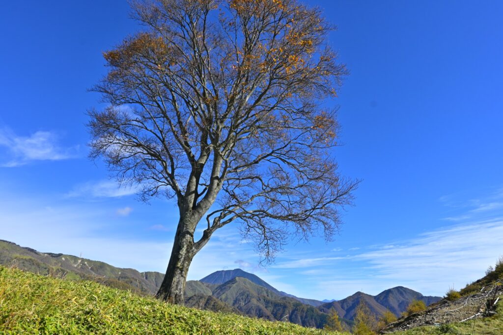 少し大きな下りの先のコルに『孤高のブナ』がありました。見てすぐわかりますね。保護のためのロープがしてあって、根元に近付けないようにしてありました。本来はここらへんブナ林だったんですかね…。足尾銅山の精錬所から出た排煙の影響で樹林は枯れてしまい、奇跡的に残った1本のブナということです。