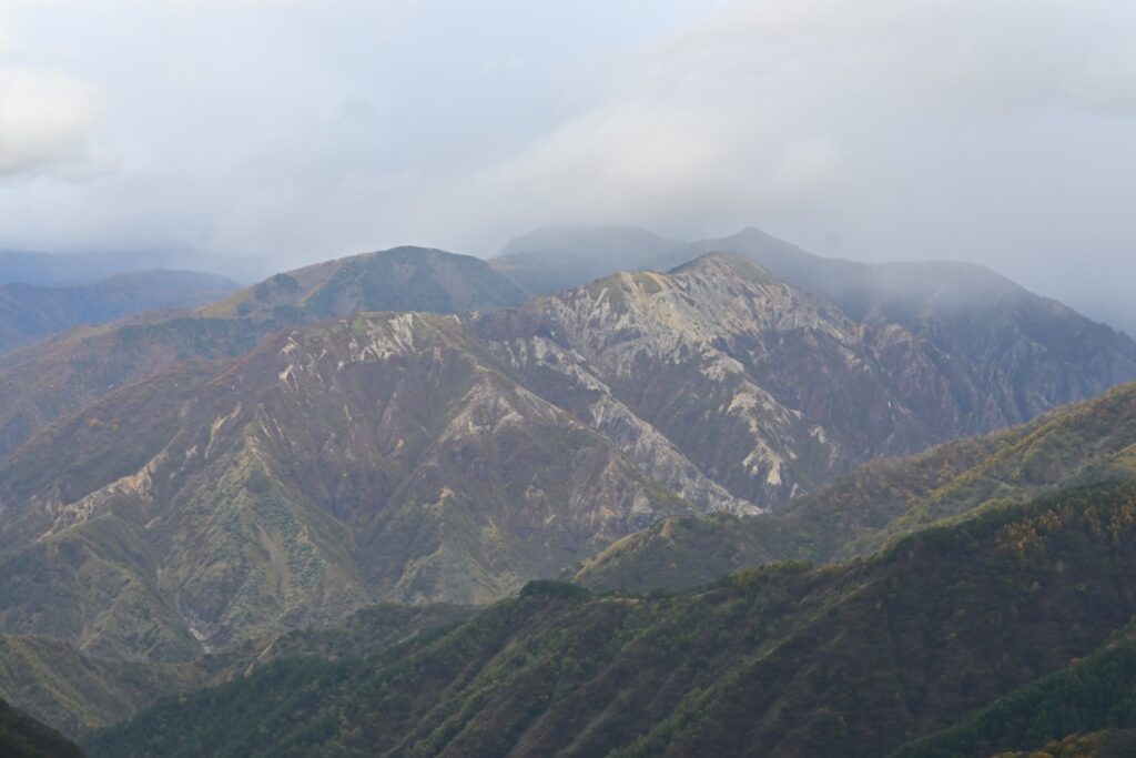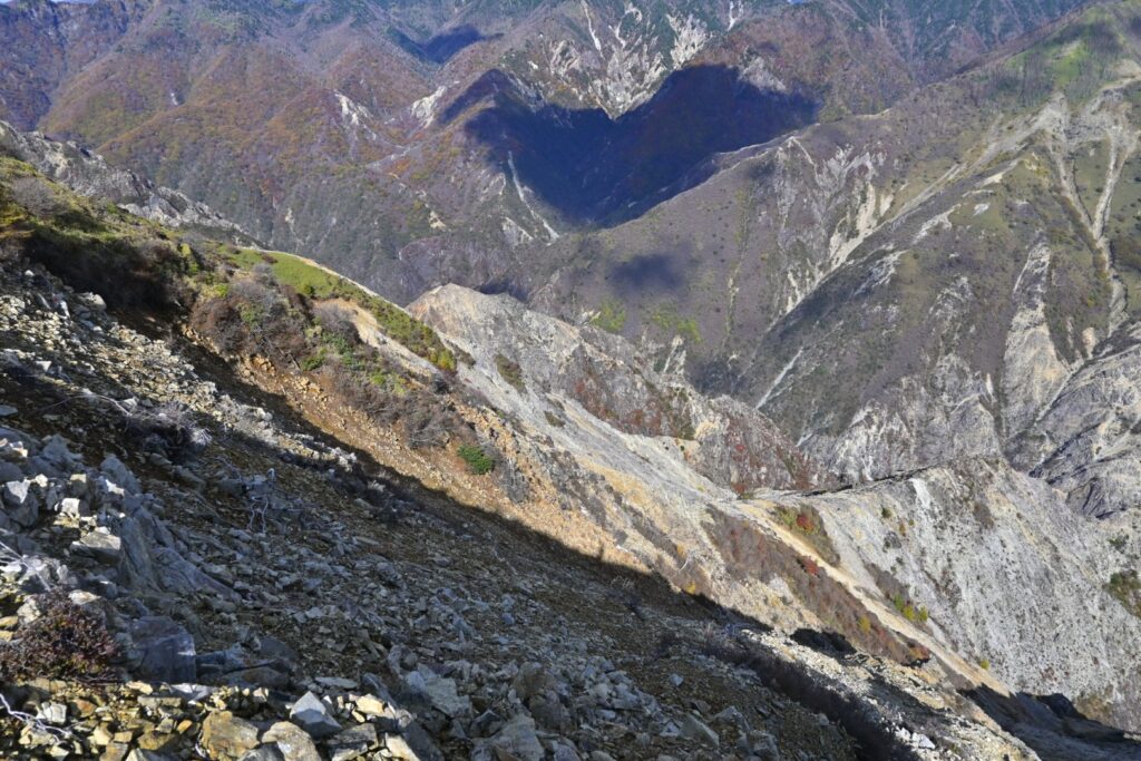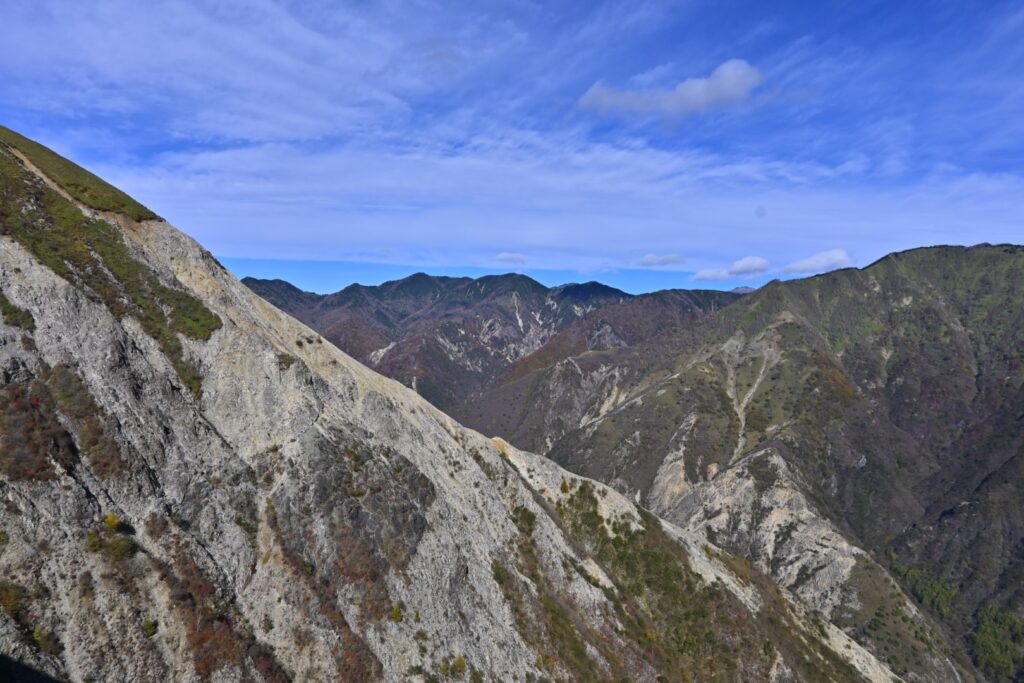 沢入山に向けてグイっと登ります。ここの登りは本格的だったので登ってるのはわかりました。はじめは笹の中の明るい疎林の斜面、上半分は右側が岩場で足元ガラガラ。これを登り切ったピークが沢入山かと思ってたら騙されました。ピークに棒が1本立ってたのでてっきり山頂と思ってました。『波平ピーク』だそうな。このニセピークから振り返る景色がまたすごい。歩いてきた稜線の右と左の差が実感できます。