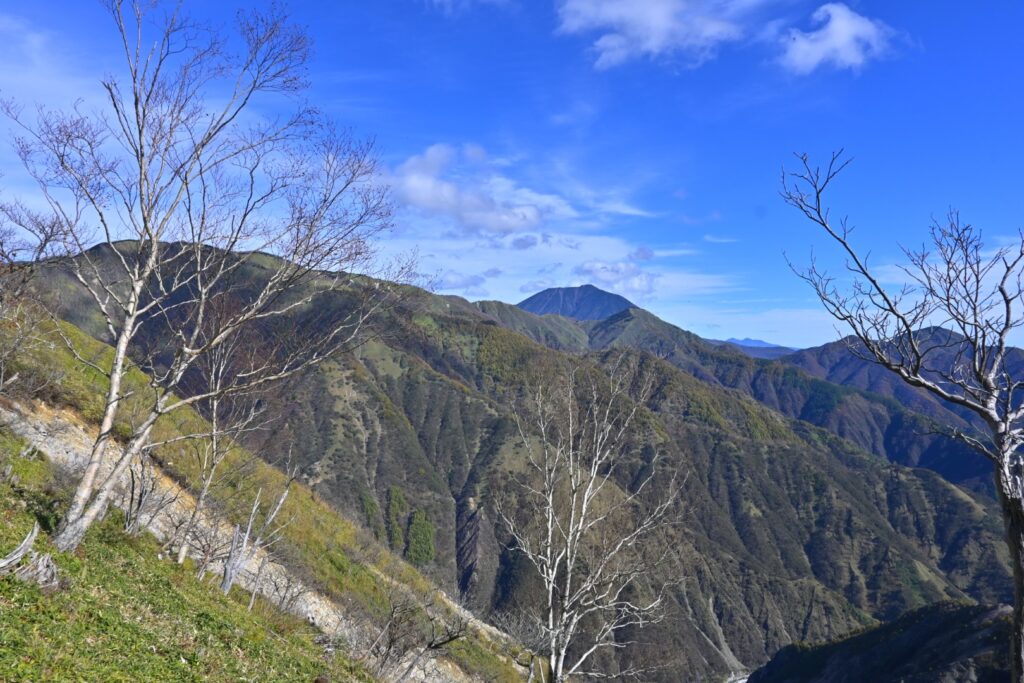 徐々に傾斜が緩み、周囲の木の高さが低くなります。そして、尾根から稜線に出ます。反対側の景色が見えてきました。大きな山の塊が手前にあって、その奥に目立つのは男体山。おお…、こんな見え方するんか~。手前の大きな山は半月山から社山、大平山と続く山並み。半月山というと日光。その向こう側には中禅寺湖があるのかー。なかなかに新鮮な景色です。