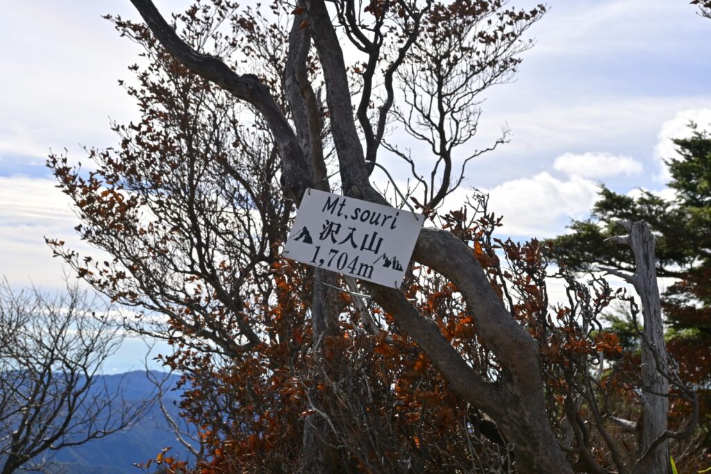沢入山の山頂は狭くて木が生えてます。その木にサザエさんの『アイムソーリー』の看板が架かっていました。山頂から少し西に進んだちっちゃなピークを最終目的地にする人が多いようです。こちらは遮るもののない360度の大展望です。まだ先には踏み跡が続いてて、この先の『オロ山』まで行く人が何名かいたようです。オロ山からさらに尾根通しで進むと庚申山ということになります。