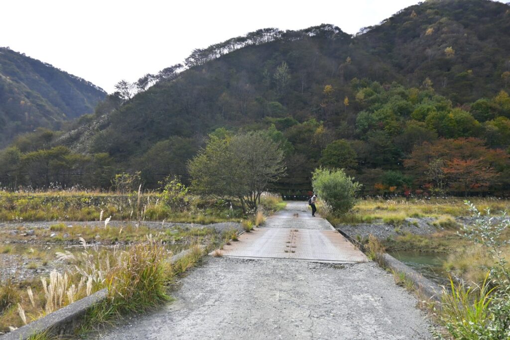 親水公園の先にゲートがあって、そこから先は一般車通行止め。ゲートの両端も塞いでありました。バイクとかも入れさせないためかな?おかげで腰が悪いのにゲートをくぐることに。このあと1本大きな川を渡り、さらにもう一つ大きな川を渡ります。ルートはクネクネしてて、なかなか先に進んでいかない感じです。植樹地帯を越え、送水管をくぐるとやっと仁田元川沿いの林道です。