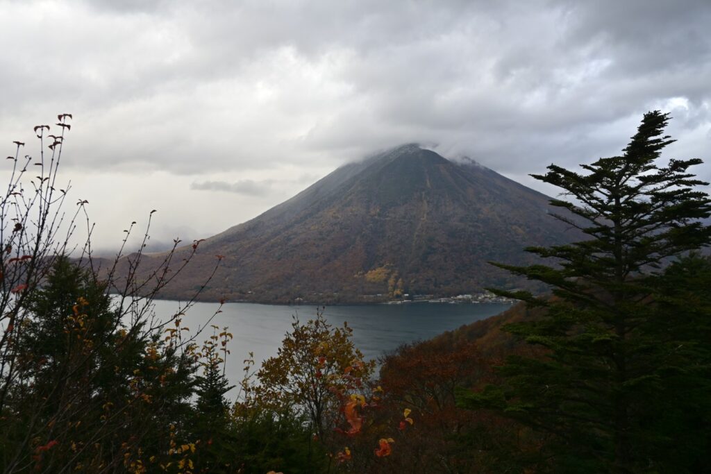 往きは写真撮ったり景色見たりで時間かけて歩きました。帰りは往きに比べてスタスタ歩いてたので、中倉山に着くのが早く感じました。名残惜しいので、最後に中倉山の先、尾根から離れるところで休憩しておきます。男体山のてっぺんに雲がかかるようになりました。