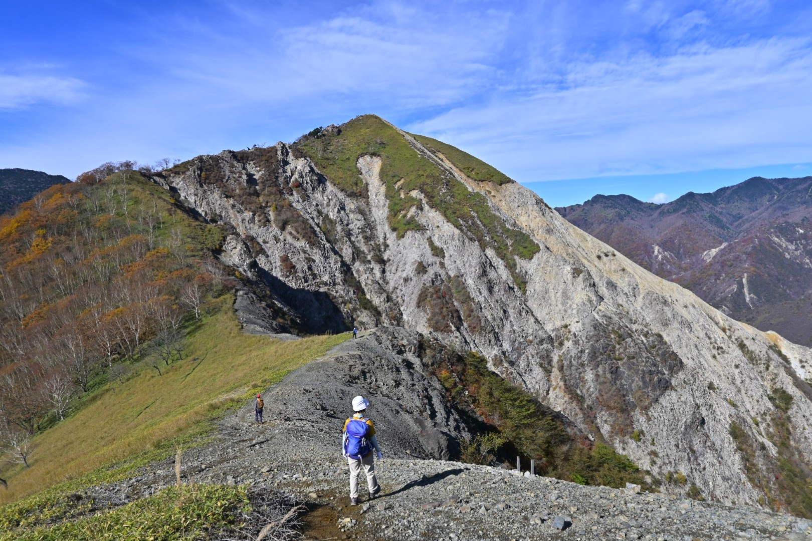 左には笹が生えてて、その中にポツリポツリと中くらいの木が生えてます。のどかな風景です。対して右側はほとんど木の生えない殺伐とした岩肌の続く斜面。左右の対比が極端です。稜線は緩くアップダウンを繰り返します。展望が素晴らしいので登りが苦になりませんね。登ってることにも気付かないくらいでした。