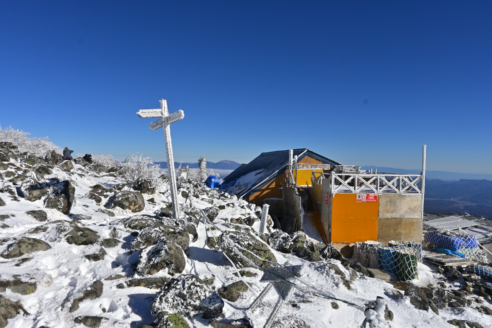 そんなこんなで山頂部。大岩ゴロゴロ地帯です。ここにも雪が薄く乗っかってて歩きにくいことこの上なし。岩の頭部分には雪が乗ってないので、そこを拾ってヒョコヒョコと登っていきます。この場合はアイゼンナシの方が具合い良いです。しかし、雪の乗った斜めった石ではアイゼン強いです。何度か滑りました。昔のような身の軽さはもうないので、滑って転んだ時の反応も悪い…。それがわかってるから余計に腰が引けるという悪循環です。