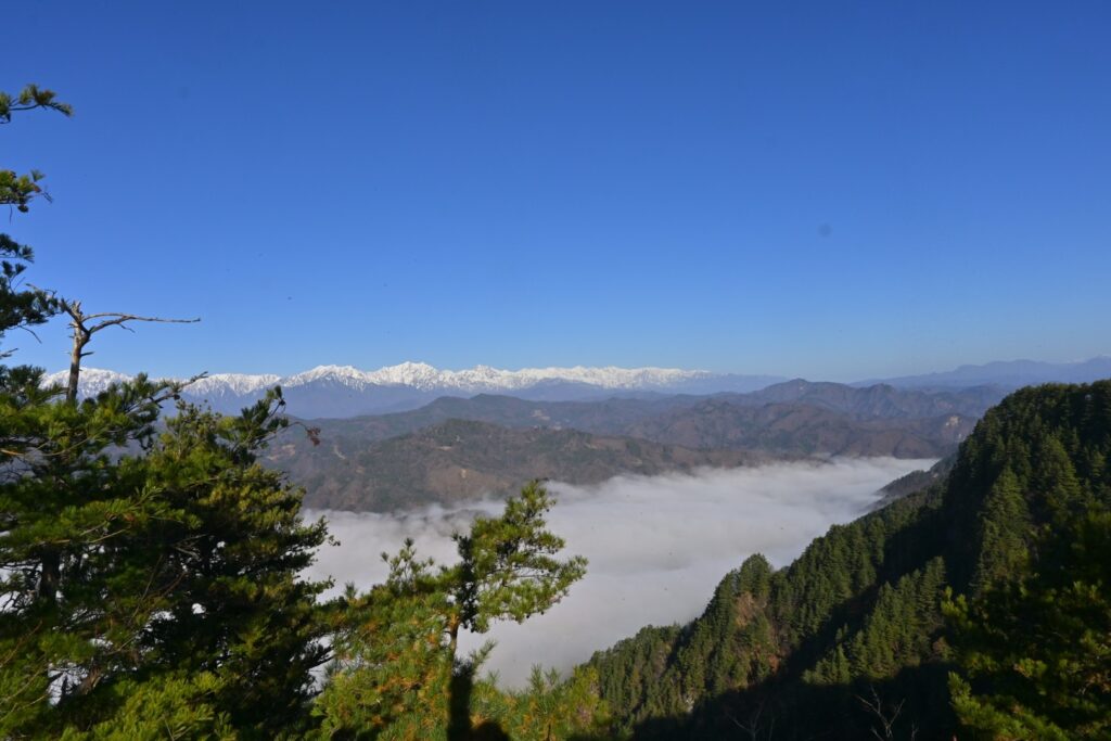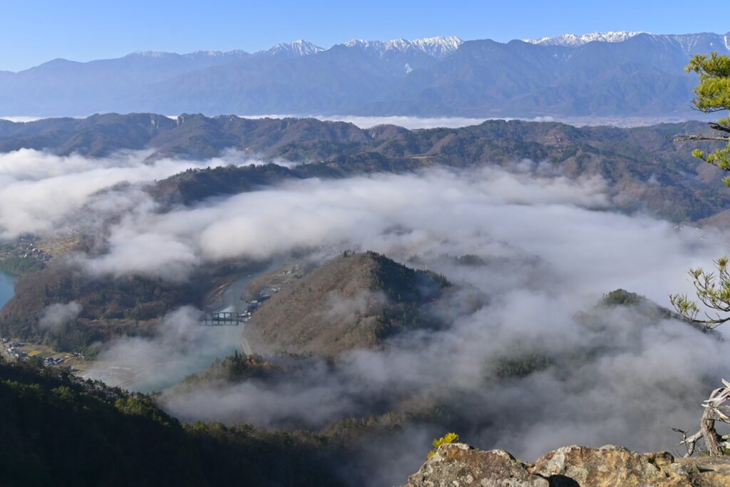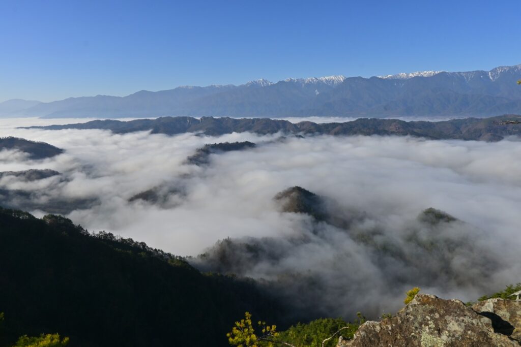 絶景ポイントはあとでじっくり楽しむとして、とりあえずは山頂に行っておこう。絶景ポイントから松林の中を登ること5分もしないうちに京ヶ倉の山頂です。北は大城と後立山連峰が見えています。ちなみに今日は大城へは行きません。メンドクサイ。西は北アルプスと蛇行する犀川が見えるはずですが、相変わらず濃い霧に覆われてしまってます。山頂は松に囲まれてて景色はあまり見えません。さっきの絶景ポイントに移動してゆっくりします。