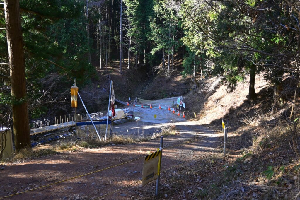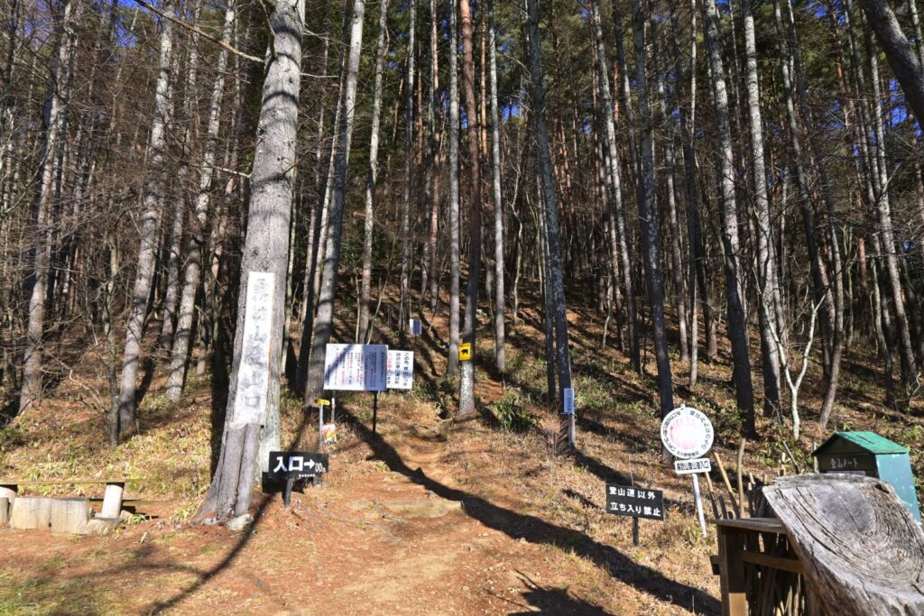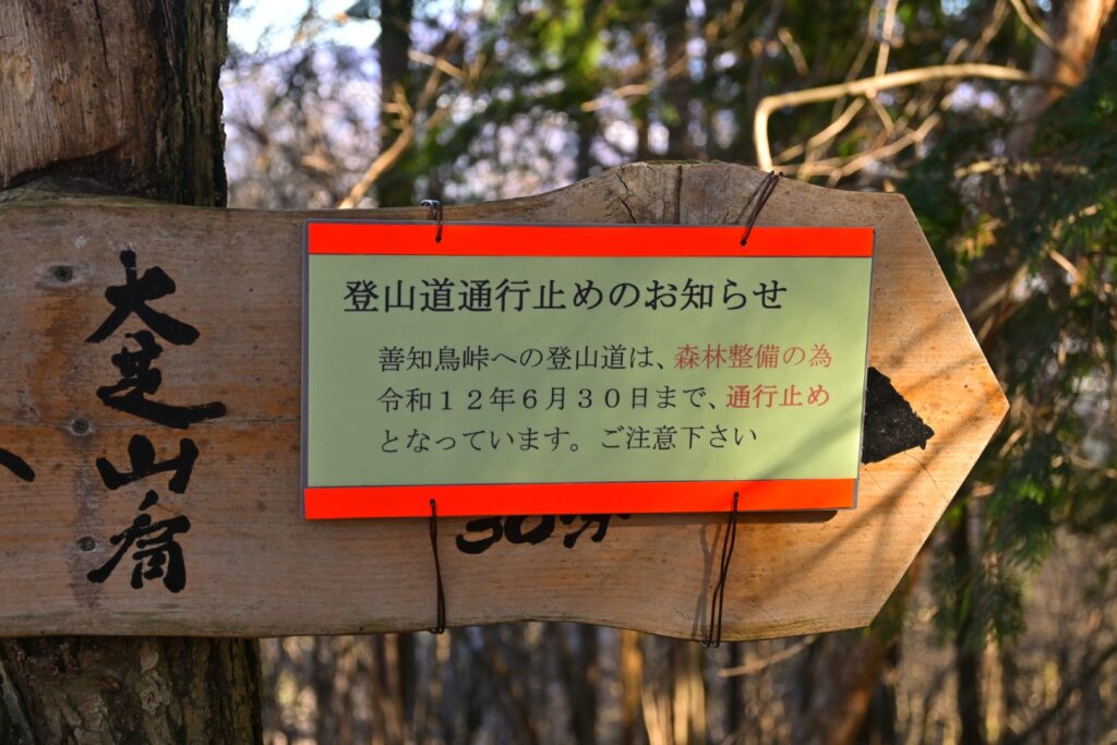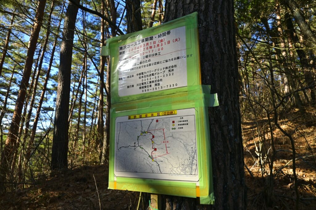この登山口付近と鉄塔で工事をやってて、できれば迂回してほしいような看板があちこちにありました。登山者用の通路は確保されてるので、通れないことはないです。それよりも、このルートを利用する意味がない気がする。