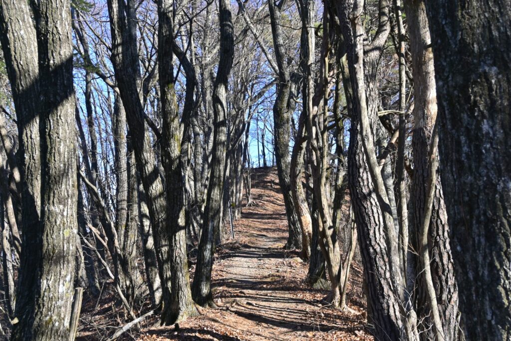 来た道を戻ります。帰りは南に向いて歩くので逆光。森はやはり順光の方がいいな。例外としてはススキの原っぱは断然逆光が良い。キラキラ光ります。あと、紅葉も逆光でもいい場合が結構あるように思います。たきあらしの峰からいったん下り、あとは霧訪山まで登りベースです。山ノ神からのコースが合流してきて、その先で男坂と女坂に分かれます。男だけど女坂へ。女坂の方がジグザグで楽。男坂の方は左側が杉林だし。