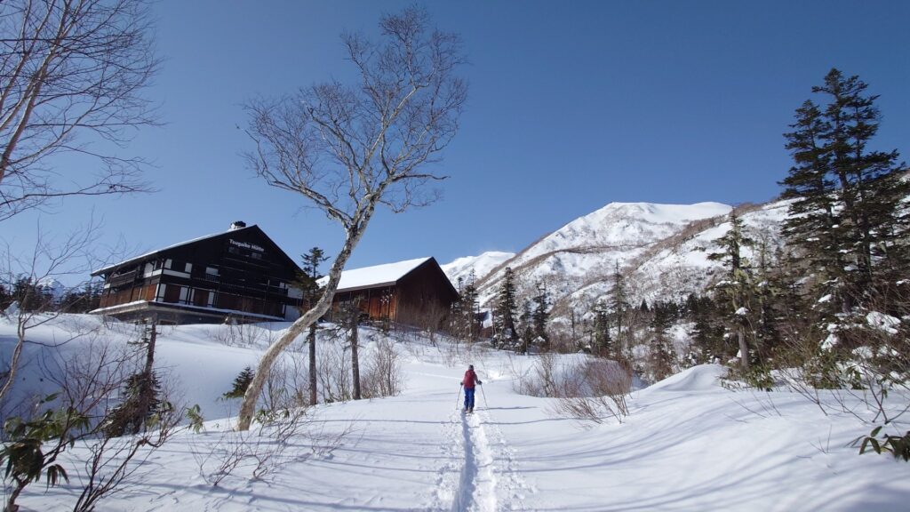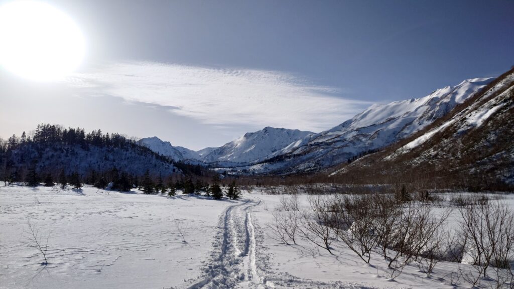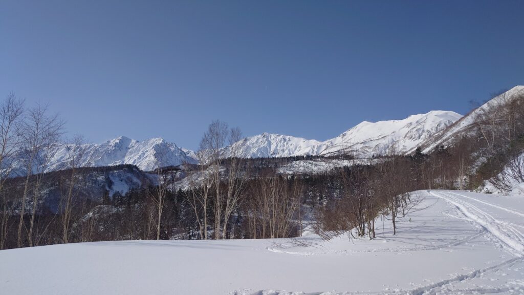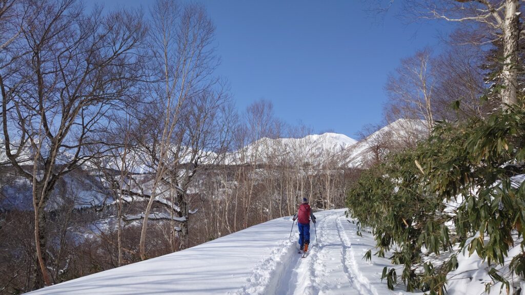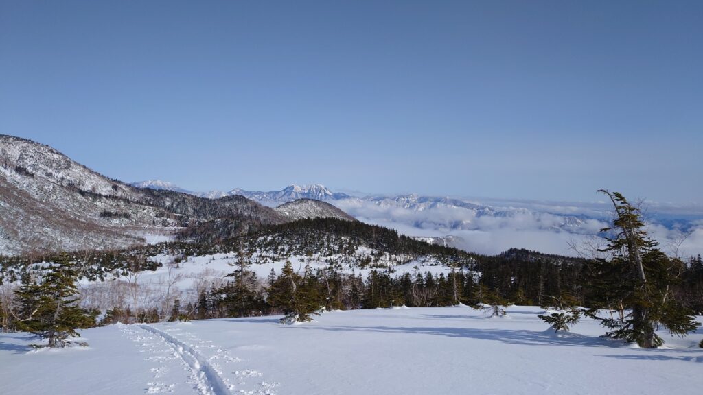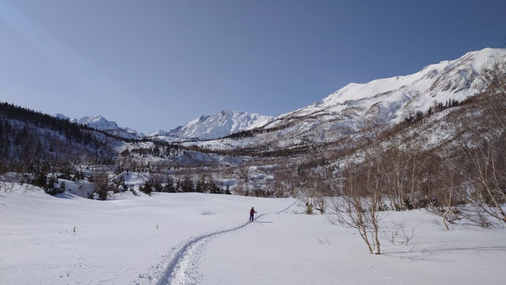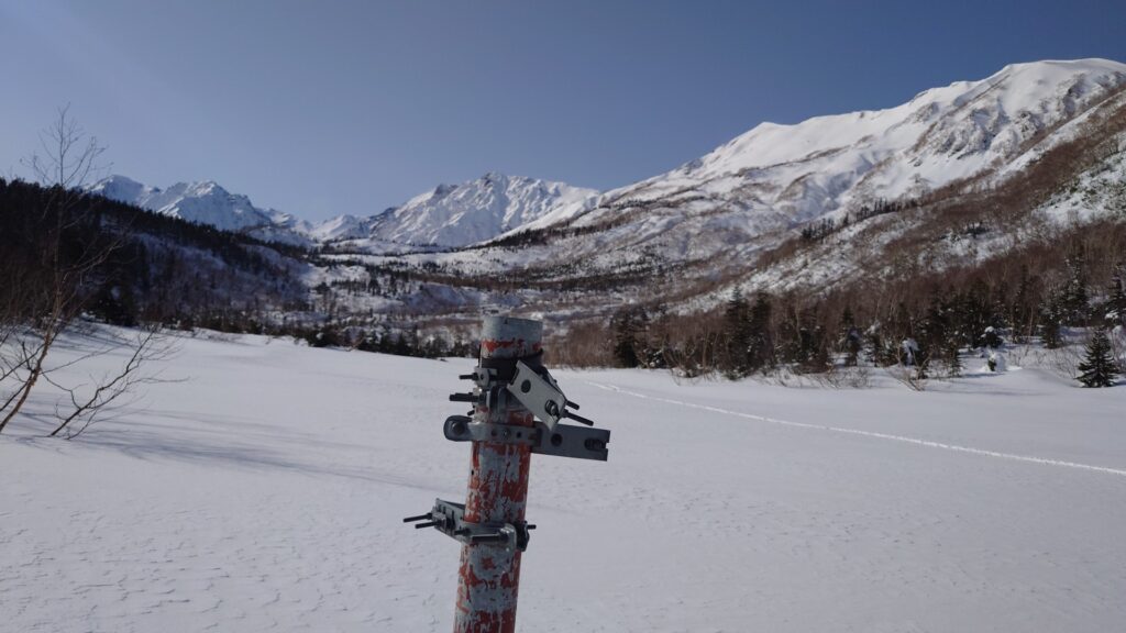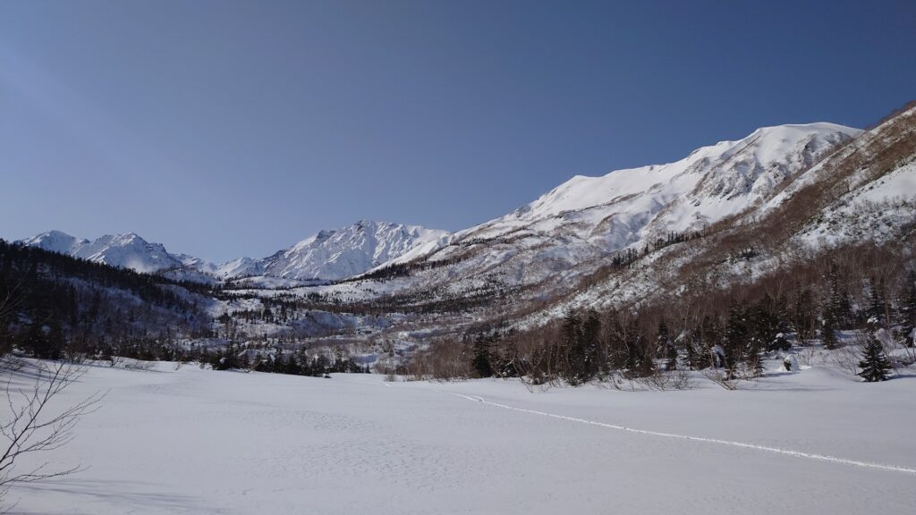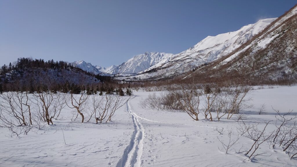 林道を歩く分には余裕の積雪ですが、横の斜面は笹が出まくってます。せっかくの絶景が笹モジャモジャでは興ざめですね。早大小屋のショートカットも笹が邪魔だけど、登るぶんには問題ナシ。成城大小屋のとこの沢はまだ埋まってるわけもなく、灌木も埋まってないです。天狗原下部から林道までがまだ煩わしいかもですね。天狗原方面に向かうトレースと自然園に向かうトレースの二俣は1:1くらいでした。