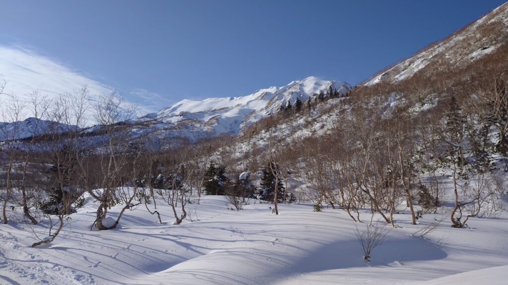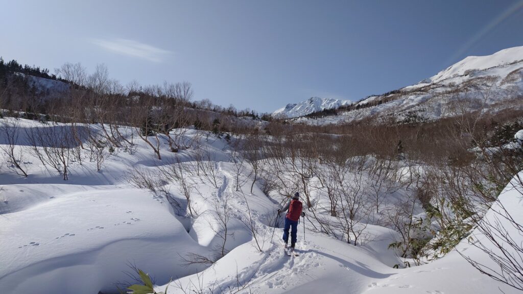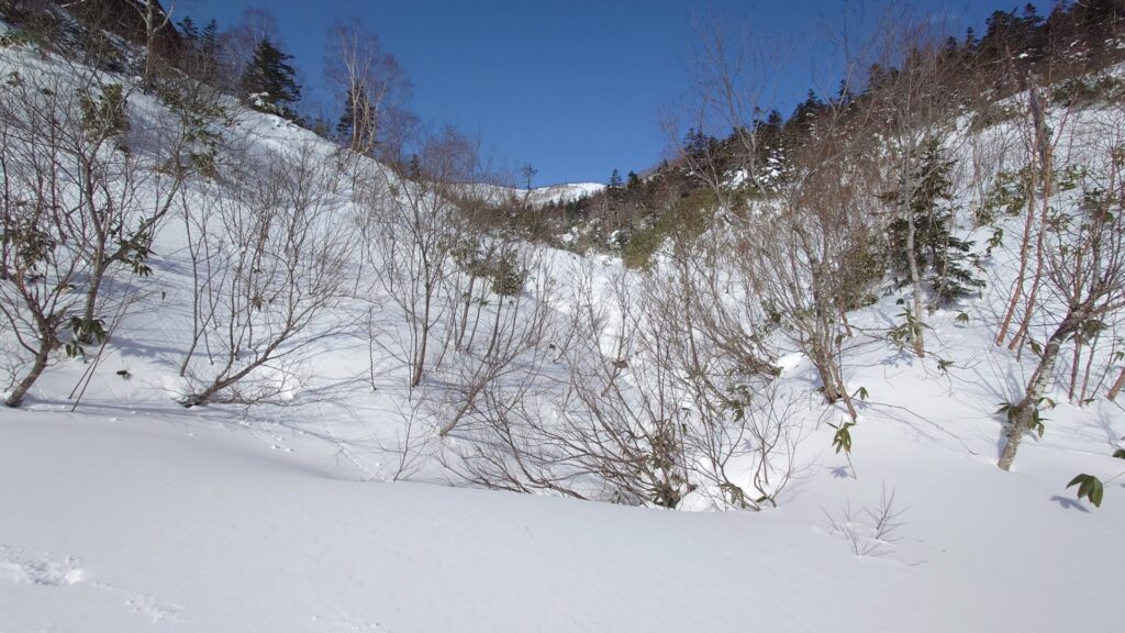 緩く下っていって楠川を渡るところ。さすがに小沢が縦横無尽にあって埋まっていません。灌木もモジャモジャに生えてます。ハイシーズンになると真っ平らになるんでしょうけどね。灌木やら小沢を縫ってルートどりしないといけないので大変。楠川と金山沢を分ける尾根まで行ければと思ってたけど、意外と遠い。時間も余裕があるわけではないので、途中のこんもりとした丘まででやめとくことにしました。