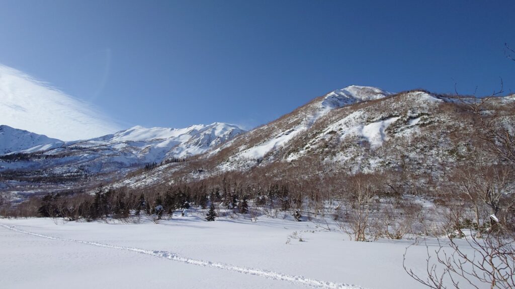 自然園は先週の誰かの記録を見たら、まだ木道がわかるくらいの積雪。今日はどうかな~と見てみると、もう木道の形跡はなくなっていました。一昨日夜からのドカ雪で一気に埋まりましたかね。ただ、まだ灌木は埋まるわけもなく、景色はスッキリ感に欠けます。ハクノリ南面もヤブヤブ。船越の両側は真っ白な斜面になってて、右側の広い谷に滑った跡がありました。