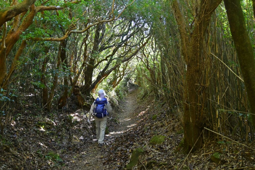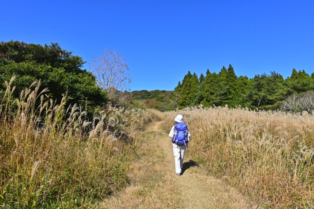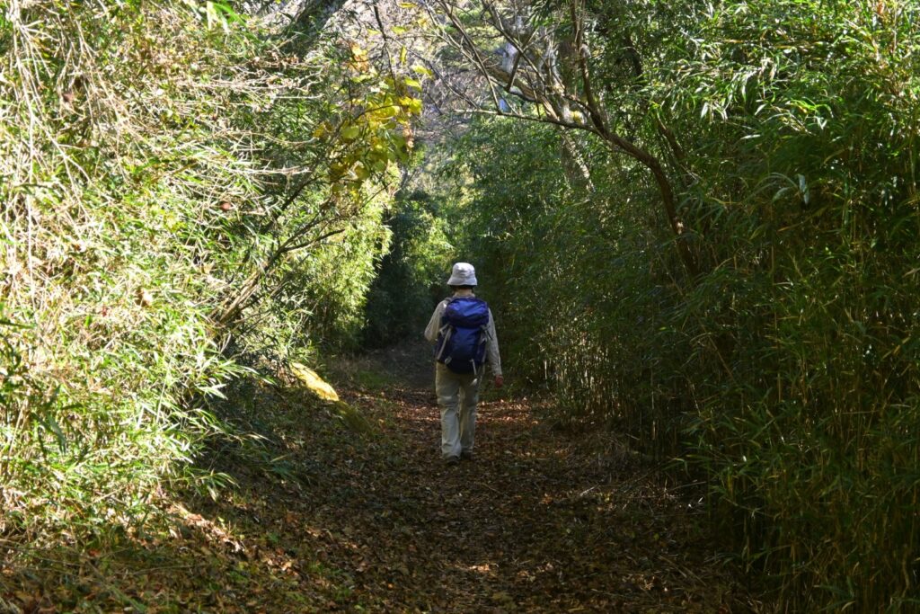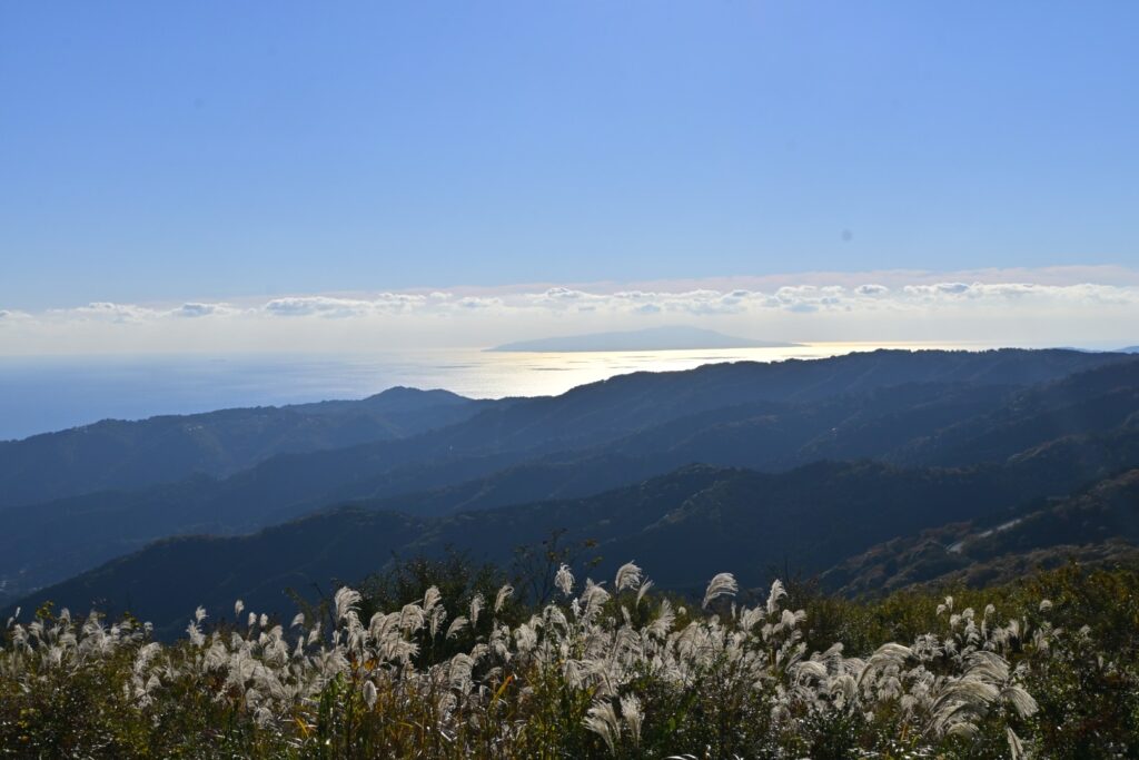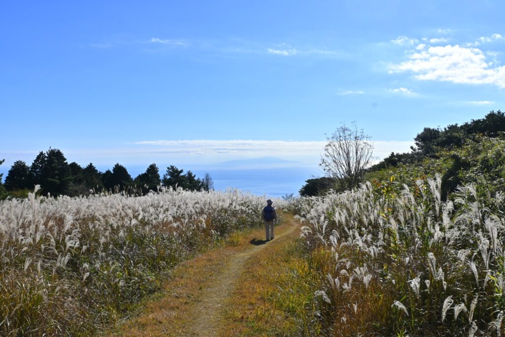 姫の沢公園からさらに車道を下ると東光寺。この先から山道になりました。岩戸山までの山道の大半は、伊豆独特?の背の高い笹に両側を覆われています。展望は皆無。ところどころで笹の勢いが弱くなる部分があって、ちょっとだけ展望らしきものが得られます。一番よかったのは『笹の広場』。笹の広場という地名なのに笹は少なく、ススキの原が広がっていました。逆光でススキの穂がキラキラ光っててキレイ。その先に海が見えていました。