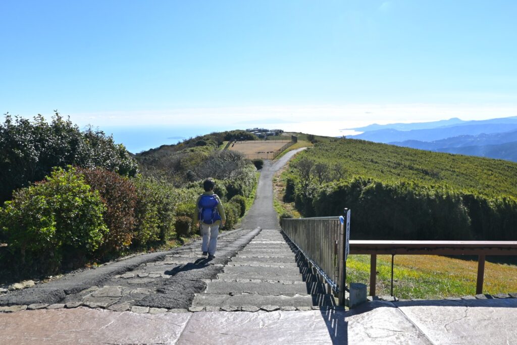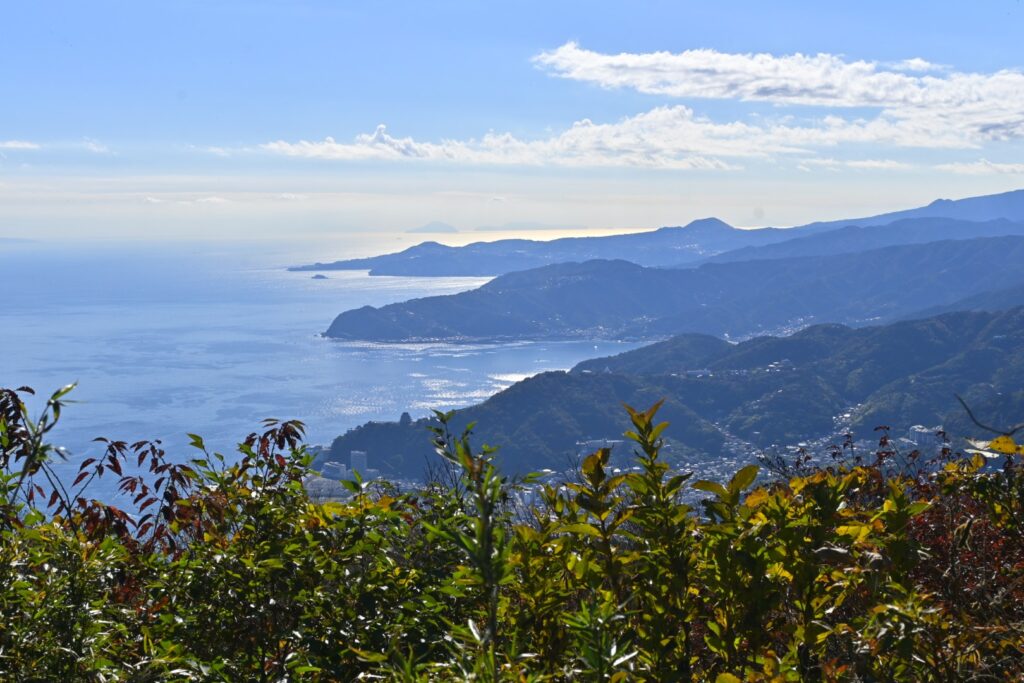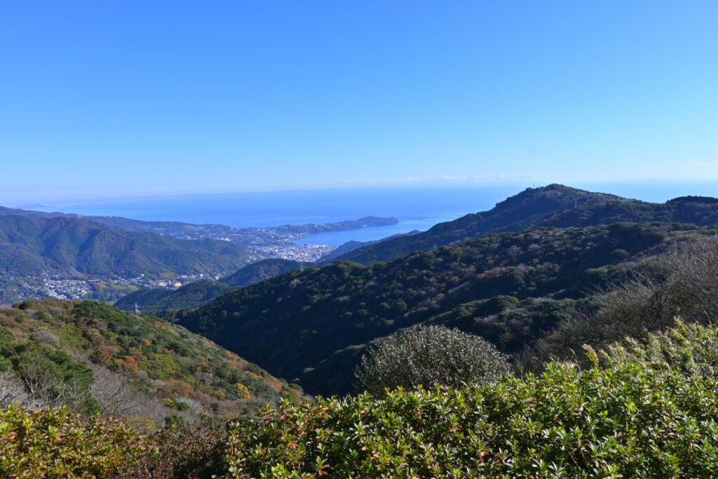 岩戸山山頂では展望があるようなことが書いてあったけど、展望があるのは伊豆大島方面のみ。山頂部は尖ってるので、全方向見えるようにしてくれたらいいのに…。山頂は狭いけど8人くらい座れるベンチとテーブルがありました。せっかくなのでのんびり休憩。休憩している間に下から3人組、2人組と登ってきました。まあまあ人気があるようです。ケーブルカーからの往復は邪道なのか、それっぽい人はいませんでした。