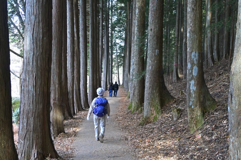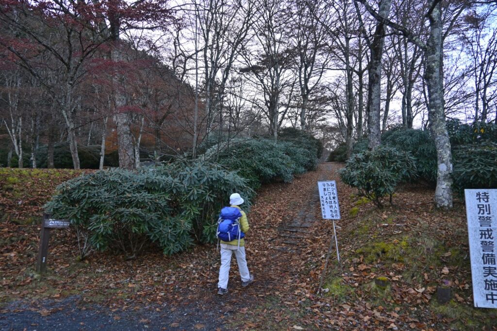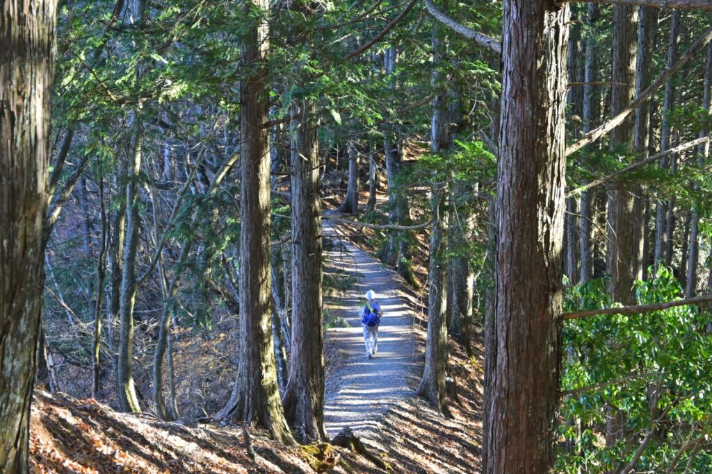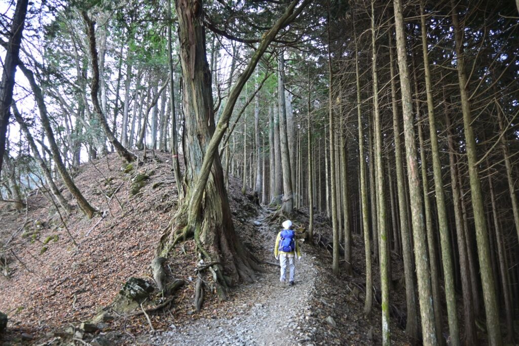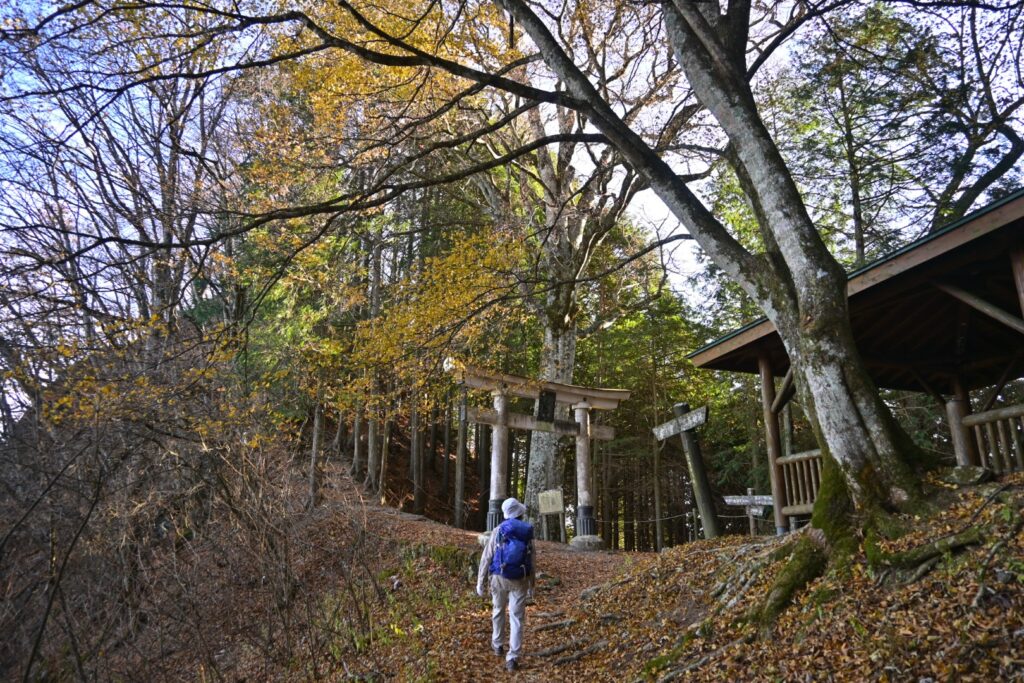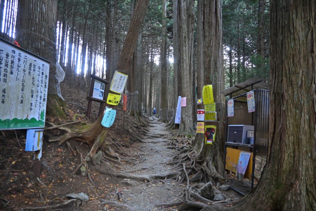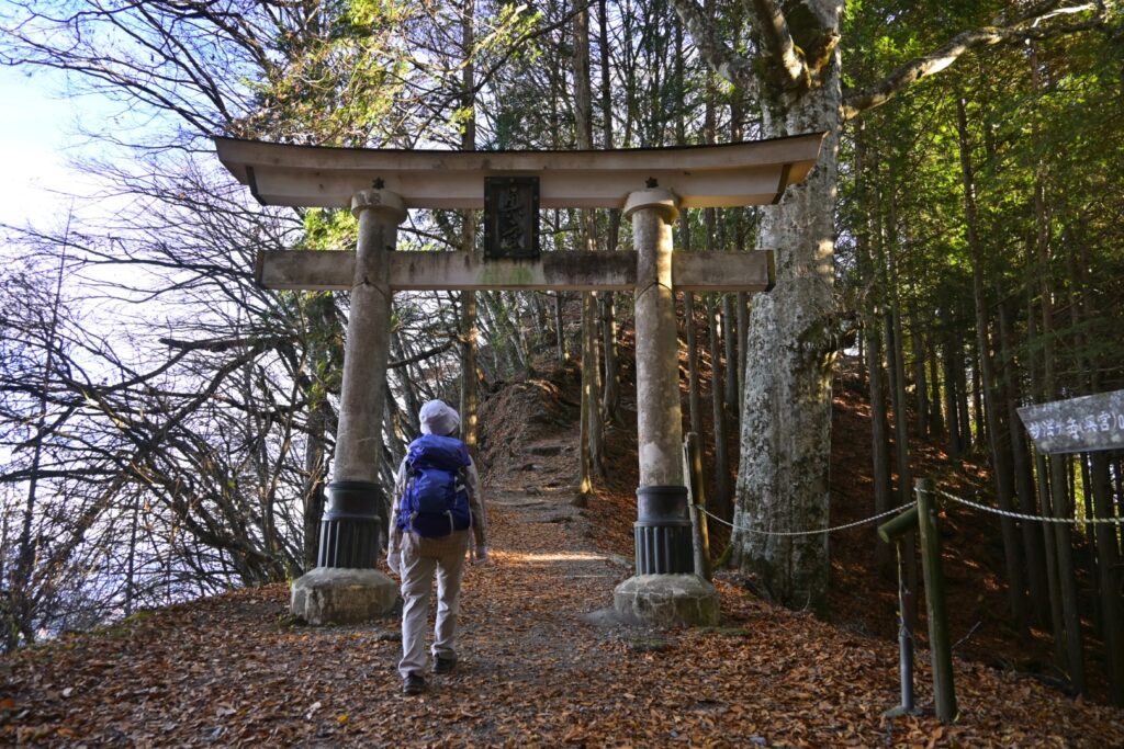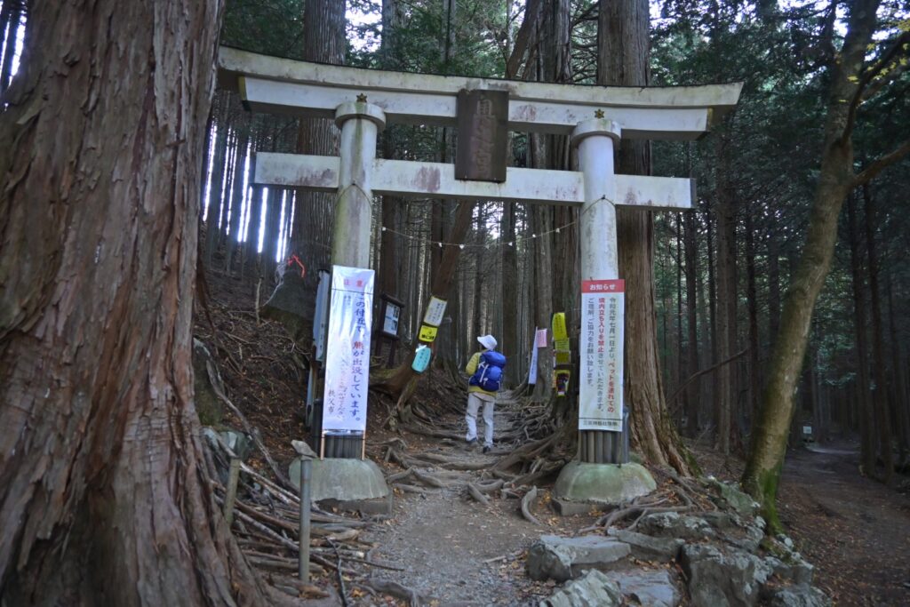 まずは妙法ヶ岳に向かいます。はじめはシャクナゲ畑のような面白い雰囲気のとこを進みます。そのうち杉林に変わります。何度か鳥居をくぐります。杉林なうえに太陽が射さないので暗い雰囲気だし寒い。これから登る妙法ヶ岳への尾根が太陽を隠してるようです。妙法ヶ岳は三峯神社の奥宮ということでか、歩いてる人は登山客というよりか観光客っぽい人が多いです。しかも、こんな朝っぱらから。なんでこんな朝っぱらから多いのか、理由は下山後にわかりました。混む前に来たってことだと思います。